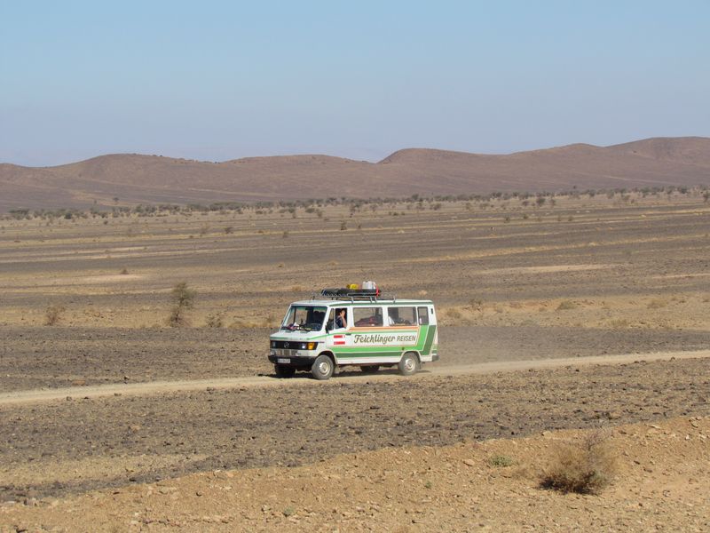 Morgens nach dem Aufstehen entlüfteten wir die Kupplung vollständig, fuhren danach ein paar Kilometer nach Osten und hielten an. Mit gezogener Handbremse ließ Lummi die Kupplung kommen, der Motor starb ab, alles war wie neu. So entschieden wir uns recht kurzfristig, die Fahrt über die Piste durch die Westsahara mitzumachen. Wenn nicht jetzt, wann dann? Um 12.20 Uhr ging es los, km 221.653. In Assa kauften wir Lebensmittel, auch für den Notfall ausreichend Wasser und Sprit. Die Briten tankten nach uns, wir fuhren vor, hielten am Abzweig im Ort und wurden erst mal von einer Horde Kinder angegrattelt.