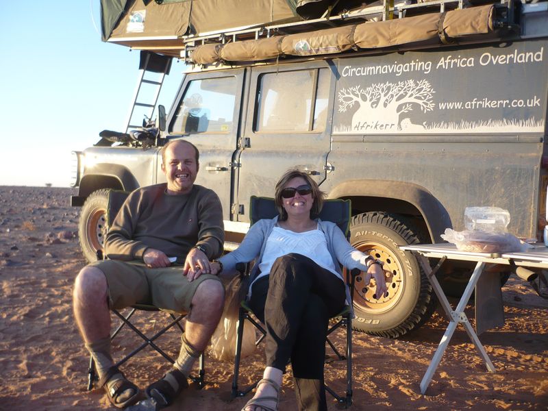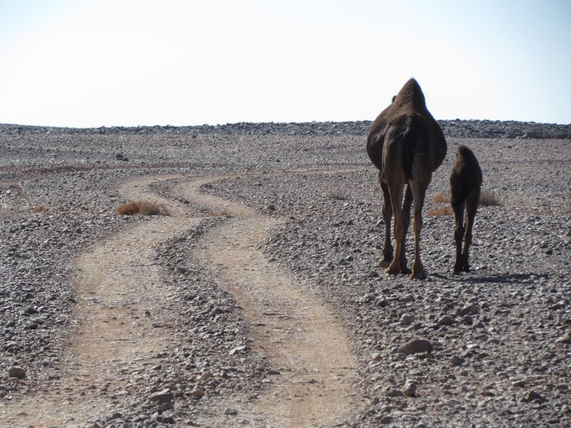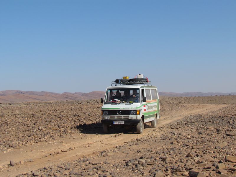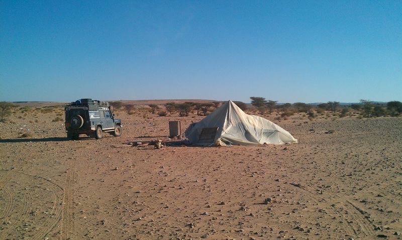 Es folgte die totale Einsamkeit. Wir brausten durch das Nichts. Bis zum Abend sahen wir drei Zelte einer Nomadensiedlung, zwei Menschen, einen Jeep und zwei Kamele that’s it. Heute hatten wir keine große Sandpassagen zu bewältigen, bis hier hin wäre die Strecke auch mit 2WD machbar. Pünktlich machten sich die Briten wieder mal einen Tee. Ich fühlte mich an „Asterix bei den Briten“ erinnert.