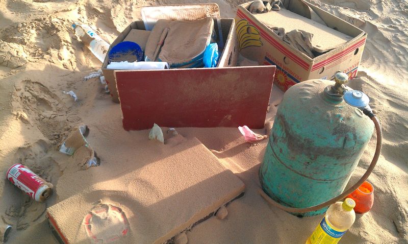 Am Morgen war alles, was wir draußen stehen lassen hatten, mit einer dicken Sandschicht überzogen. Die Düne war mit unserem Besuch nicht ganz einverstanden und ließ sich nicht vom Wandern abhalten. Der Wind war auch noch da. Das Frühstück fiel daher aus.