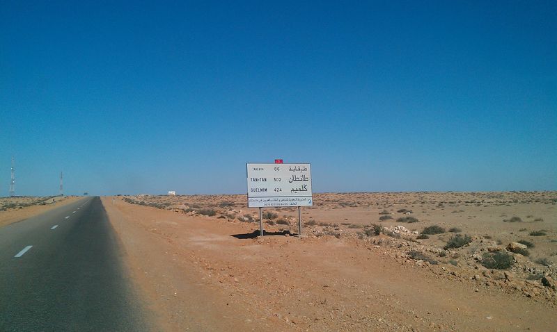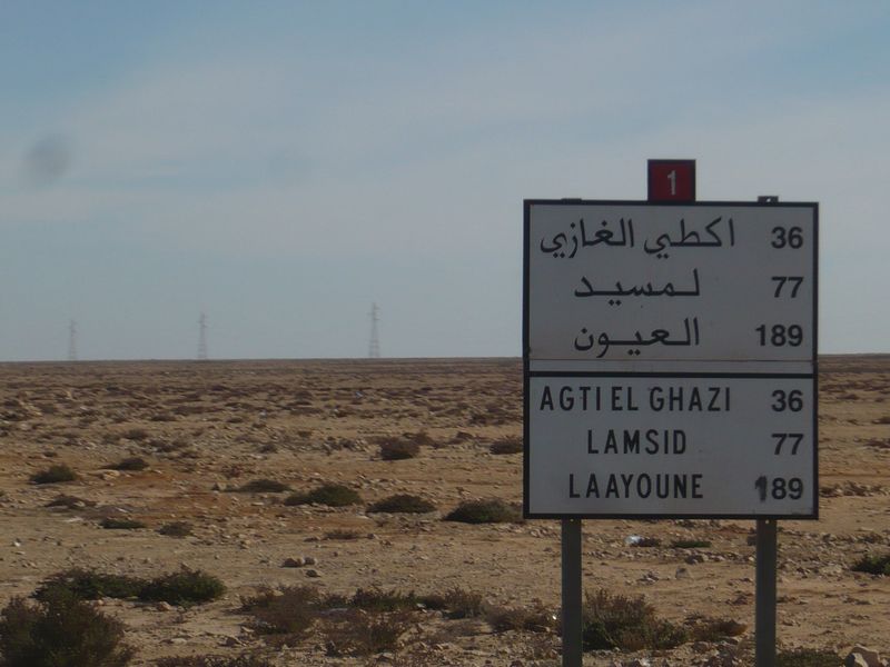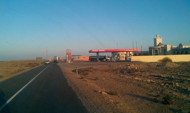 Endlich schafften wir es mal ohne uns zu verfahren durch Laayoune. Bald kann ich es im Schlaf. In Tah überquerten wir wieder die „Grenze“ nach Marokko. Einige Kilometer dahinter folgten die „drei Tankstellen“, die ersten bzw. letzten mit zollfreiem Sprit. Dort preßten wir noch mal so viel wie ging in den linken Tank. Bei meiner ersten Marokko-Fahrt wußte ich das nicht, daß das Zollfrei-Gebiet nicht an der Grenze zur Westsahara, sondern schon früher beginnt und habe erst in Tah getankt. Wohl zu dem Zweck, daß man hier nicht tausende Kanister füllt, sind die drei Tankstellen in Sichtweite eines Polizeipostens. Zum Glück hatten wir das schon vorher erledigt.