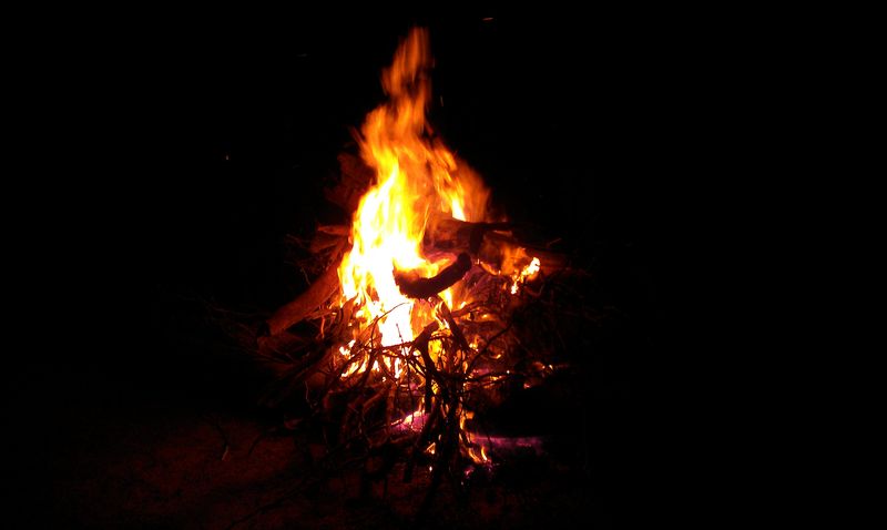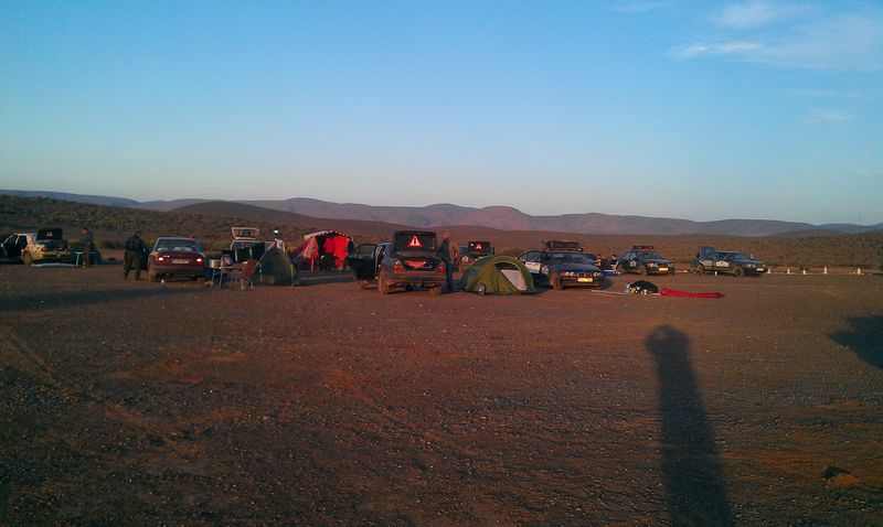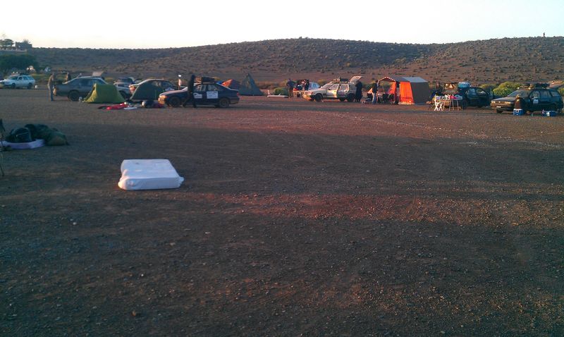 Einige der Rallyeautos hatten riesige Holzvorräte auf den Dächern mitgebracht, pünktlich zu Sonnenuntergang war das Lagerfeuer angerichtet und ein riesiger Kreis Campingstühle bildete sich darum. Eine Gruppe Studenten verheizte einen 20l-Wehrmachtskanister Altöl im Feuer, den sie über eine ausrangierte Kaffeetasse nach und nach im Feuer versenkte.