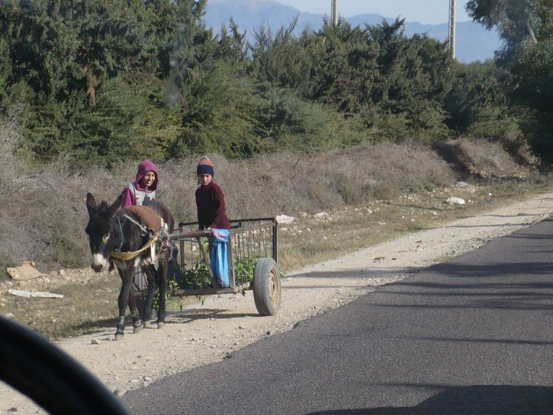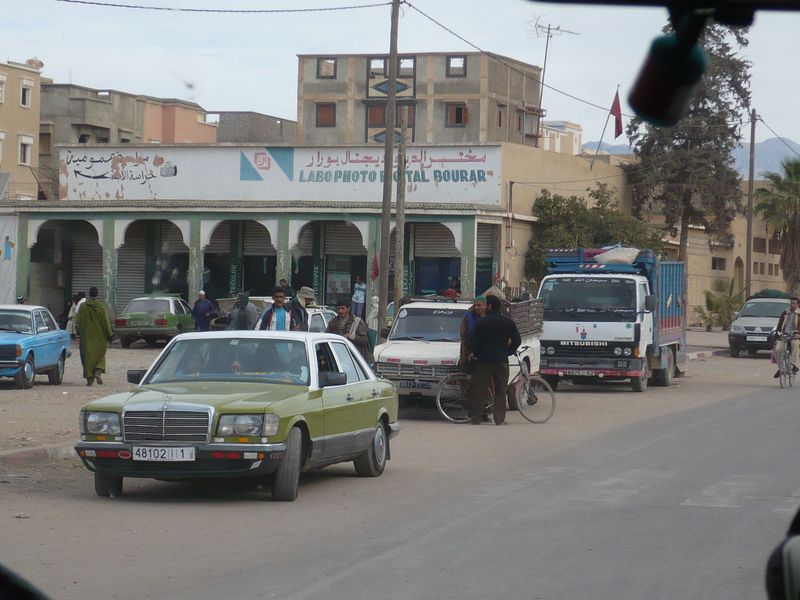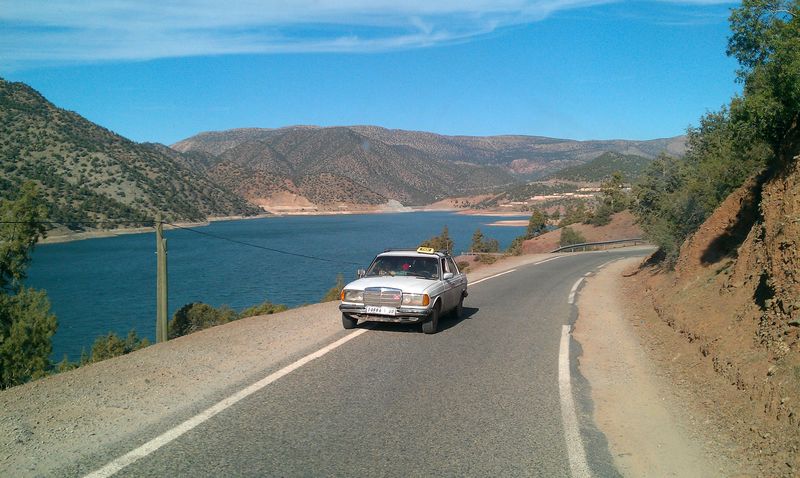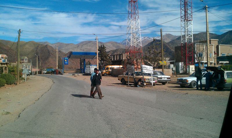 Beim Bezahlen des Platzes (100 MAD) unterhielt sich ein lustiger Spanier mit britischen Wurzeln mit uns und sorgte für einen guten Einstieg in den Tag. Um doch noch etwas vom Atlas und Marokko zu sehen entschlossen wir uns spontan zur Fahrt via Tizi-n-Test statt über die Autobahn. Im Dorf vor dem Abzweig zum Paß war gerade Souk, hier gab es auch gleich zu Mittag: Köfte für mich, Fisch für Lummi. Als wir zum Auto zurückkamen, bettelte uns ein kleinwüchsiger Marokkaner an. Er ging mir kaum bis zur Hüfte.
