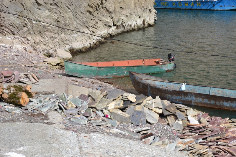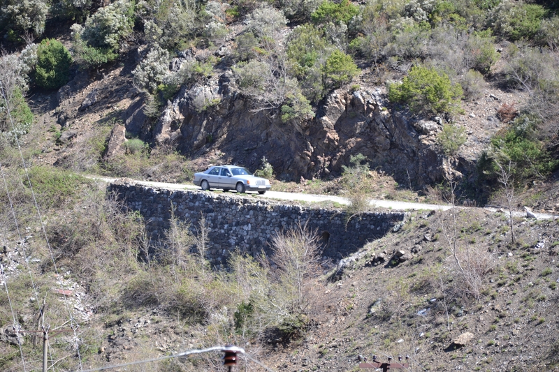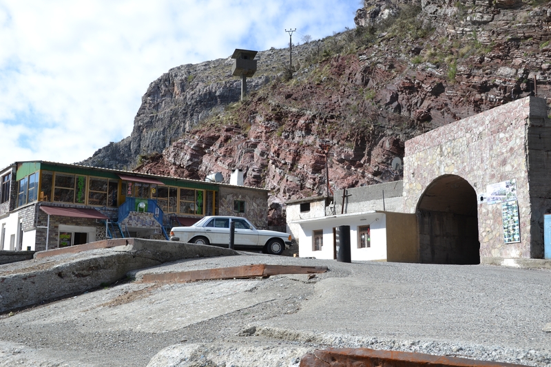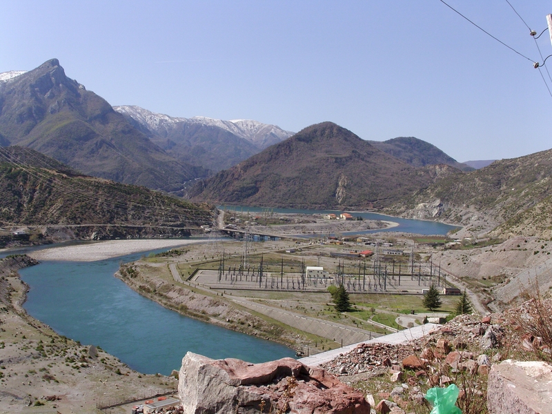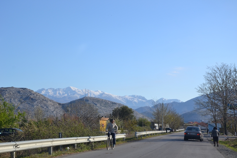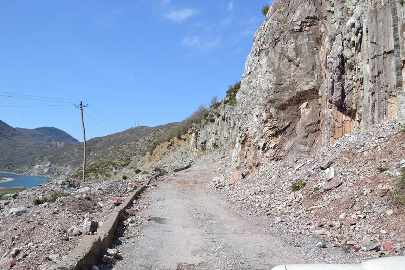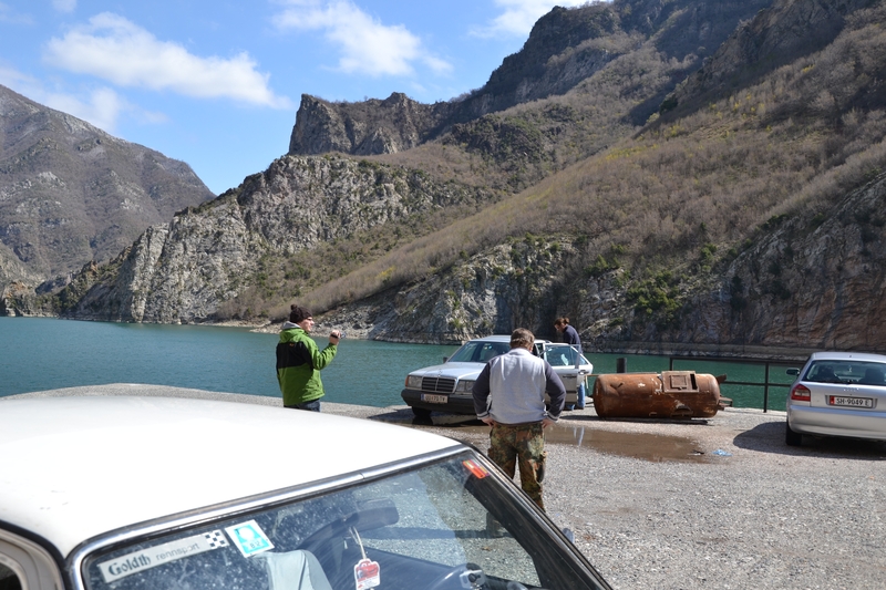 Dort angekommen war kein Betrieb zu sehen, keine Fähre, nur ein Café. Dort ging ich hinein und fragte. Man verstand mich nicht so recht, aber man konnte mir klar machen, daß es keine Fähre gab, nur die Straße nach Norden. Mein Handy funktionierte nicht, und Jonas hatte kein Guthaben. Daher konnten wir nicht Bescheid sagen, daß die anderen sich nicht mehr beeilen bräuchten. Wir mußten auf sie warten. Dann machten wir bei einem Café einen Ersatzplan und fuhren auf der Straße nach Norden in Richtung Kukes. Wie wir nach dem Urlaub im Albanien-Forum nachlesen konnten, war die Fähre 2011 gesunken. Es gibt nun nur noch die Personenfähre, die wohl auch nicht täglich fährt. Wegen der mangelhaften Informierung der Öffentlichkeit hat sich die Info noch nicht überall hingetragen gehabt.
