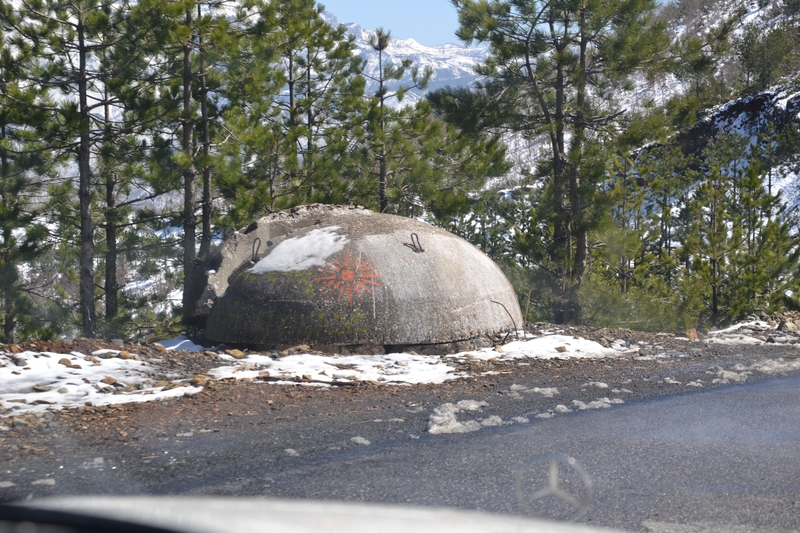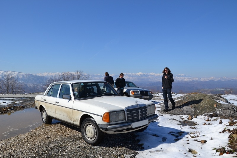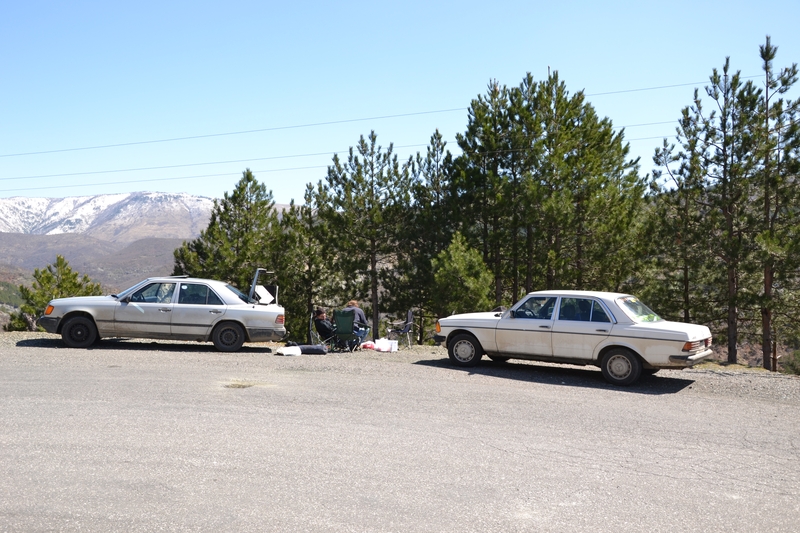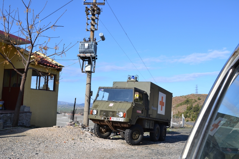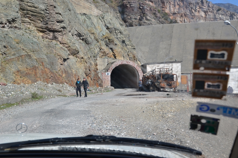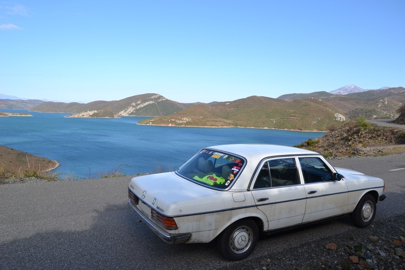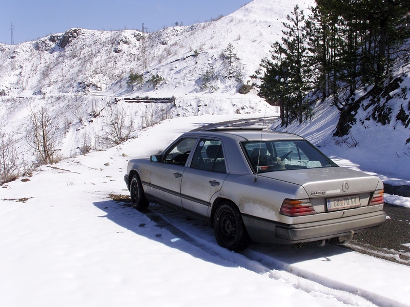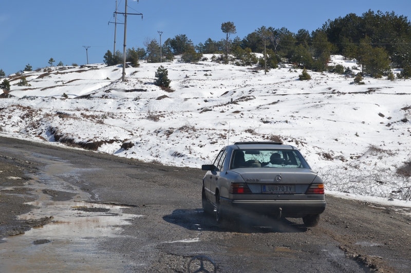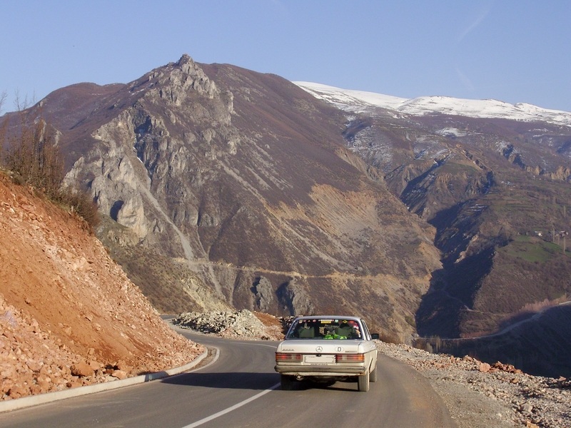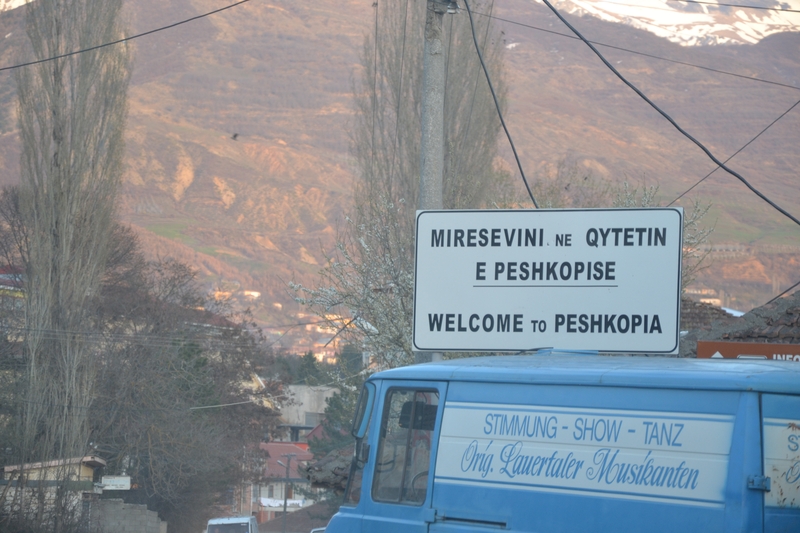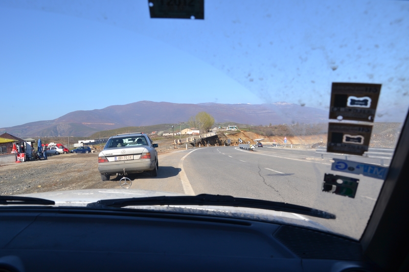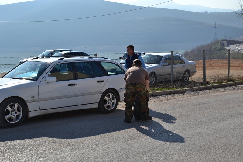 Im Hintergrund waren bereits die Berge des Kosovos zu sehen. Über das Walkie-Talkie gab es kurz vor Kukes einen Funkspruch. Mein hinterer linker Reifen war platt. Wir fuhren an die erstbeste Tankstelle und montierten den Ersatzreifen unter heftigem Genöle des Tankwarts, daß wir das doch bitte woanders machen sollten. Dann mußten wir nicht mehr lange nach einem Reifenhandel suchen. Der Händler fuhr mit seinem Auto (natürlich Mercedes) vor, ließ mich das kaputte Rad in den Kofferraum legen und einsteigen. Dann fuhren wir zu einem Kumpel von ihm in die Werkstatt. Er gab ihm 200 Lek für die Reparatur, hoffte ich hätte es nicht mitbekommen und wollte 10 EUR von mir. Ich gab ihm zu verstehen, daß ich es gecheckt hätte und wir einigten uns mit einem Augenzwinkern.