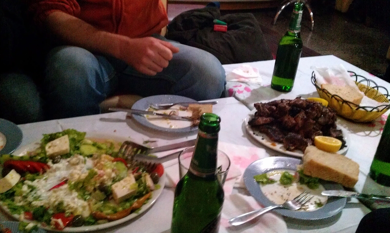 Ohne überschneidende Sprachkenntnisse bestellten wir Bier, 1 kg gebratenes Fleisch und Salat für alle. Das Essen kam fix und schmeckte vorzüglich. Der Chef hatte seine Freunde eingeladen und wir versuchten uns zu unterhalten. Dabei floß der schwarz gebrannte Raki und es wurde uns immer wieder eingeschenkt. Die ausgelassene Runde endete damit, daß wir ihnen lustige Videos auf Youtube auf dem Restaurantrechner zeigten und sie sich beinahe totlachten. Wir verabschiedeten uns erst gegen Mitternacht herzlich, es kostete insgesamt umgerechnet 38 EUR. Der Schnaps ging selbstverständlich aufs Haus.