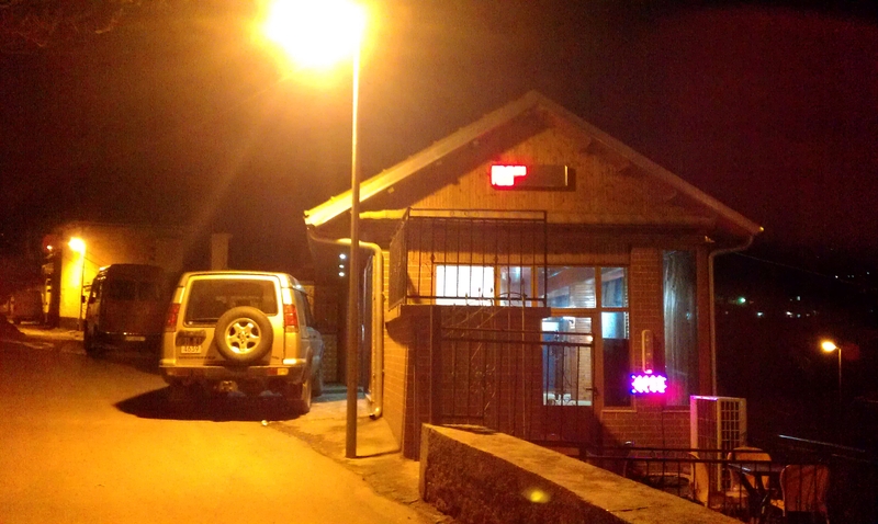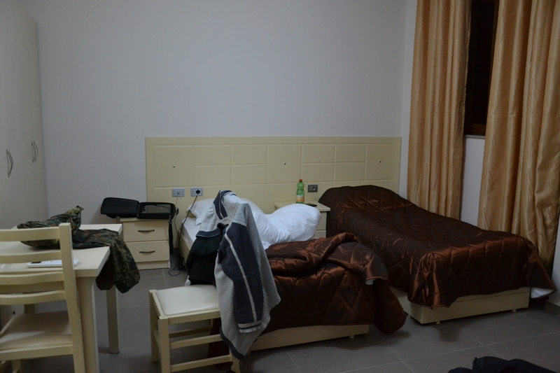 Es fand gerade der allabendliche Xhiro statt. Dazu trifft man sich abends auf der Hauptstraße und läuft hin und her und erzählt sich was. Eigentlich eine ganz nette Sache. Wir checkten in einem brandneuen Hotel, Hotel Piazza (im oberen Bild rechts mit der Leuchtschrift zu sehen). Es kostete 30 EUR pro DZ. Es sah wirklich aus, als wäre es vor wenigen Tagen eröffnet worden. Es waren mit unseren Zimmern ganze drei Stück belegt, es gab jedoch für jede Aufgabe einen eigenen Mitarbeiter, während sich der Chef im Foyer mit seinen Freunden betrank. Man bekam den Eindruck, daß hier Geld gewaschen wurde. Es war ziemlich surreal. Wir liefen die Straße runter und gingen ins erstbeste vertrauenserweckende Restaurant, die „Piceri Arberi“ in einer netten Backsteinhütte.