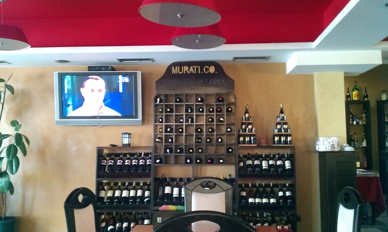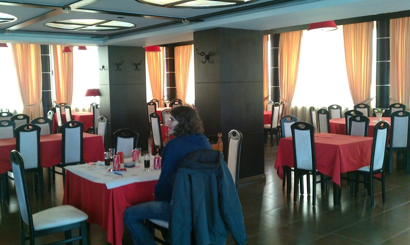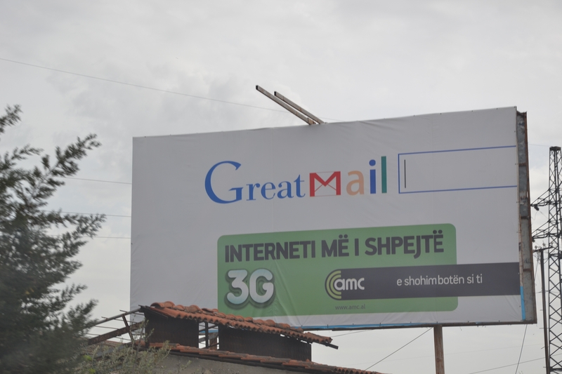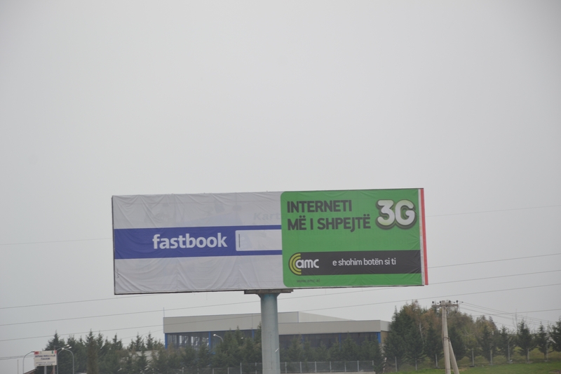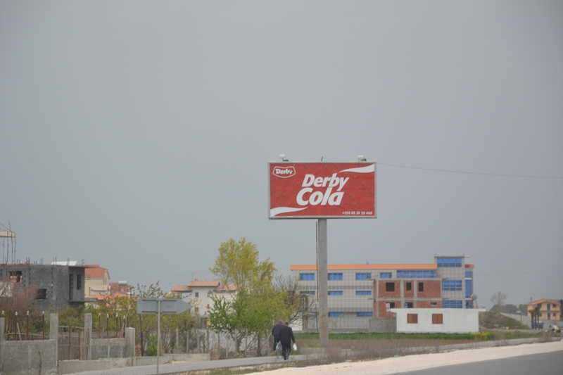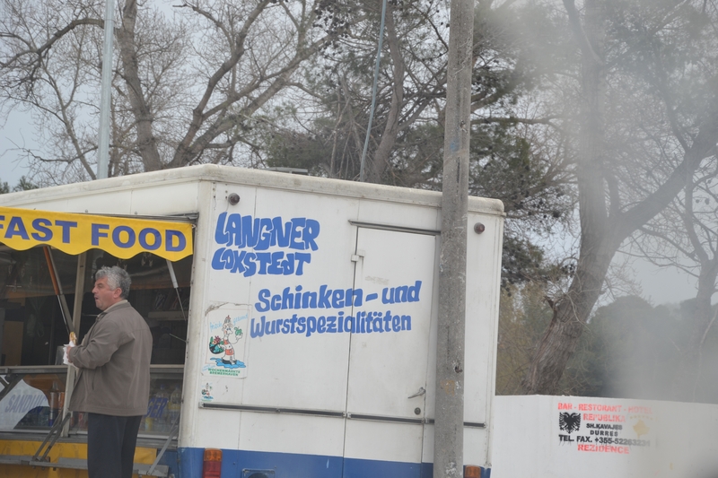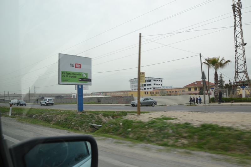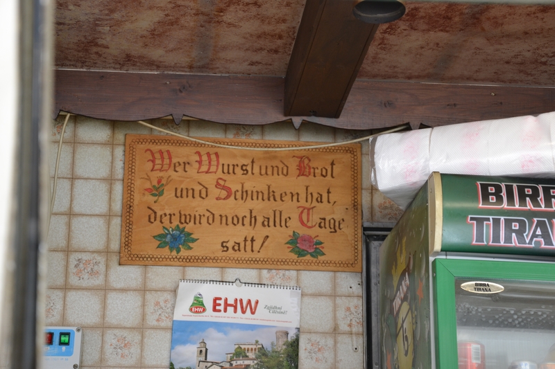 Wir mußten irgendwo tanken. Über der viel zu groß dimensionierten Tanke hing ein Überbau mit der Aufschrift „Restaurant“. Wir gingen hinein und sahen mal nach. Wir waren die einzigen Gäste und bestellten, weil das das einzige war, was wir auf Albanisch bestellen konnten, „mish“ – Fleisch. Es kam recht fix und schmeckte gut. Der leere Saal mit der teuren Einrichtung erinnerte mich an eine Nordkorea-Dokumentation. Daß das ganze über einer Tankstelle hing und ich mir wieder nicht erklären konnte, wie sich das hier rechnen soll, ließ mir die Situation nicht wirklich realer vorkommen. Im Fernseher lief die albanische Version von „Rette die Million“ und zwei mal in der Stunde fiel der Strom aus.