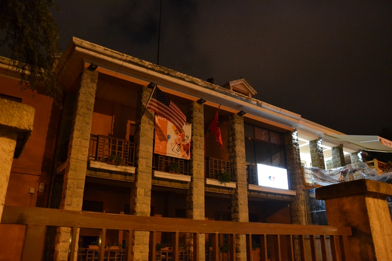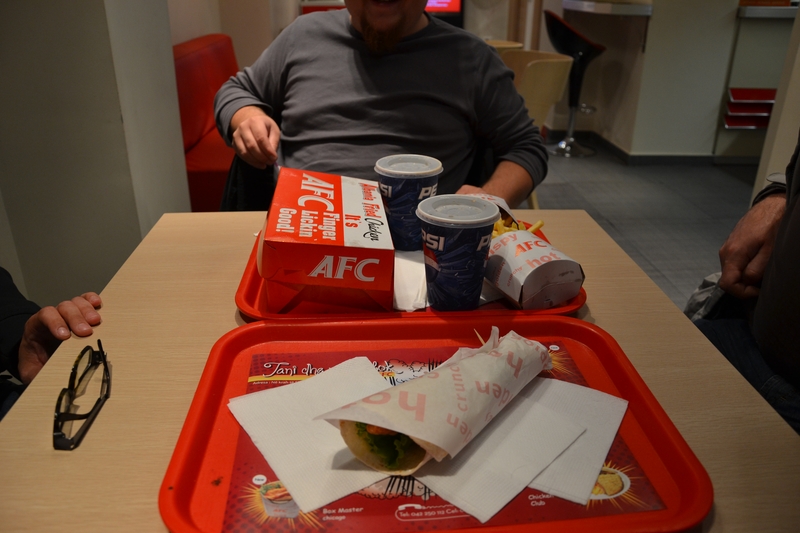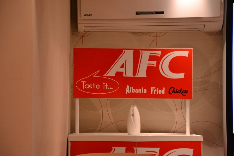 Dann ging er mit uns um ein paar Ecken, erzählte weiter und empfahl uns noch eine schöne Bar auf dem Weg. Wir dankten ihm recht herzlich für die nette kurze Stadtführung und wünschten ihm alles Gute. In der Bar tranken wir noch einen Mojito (sehr lecker) und begaben uns dann für einen Mitternachtssnack zu Albania Fried Chicken, über das wir uns vorhin schon lustig gemacht hatten. Der Laden war eine dreiste KFC-Kopie. Sogar die Verpackungen und die Produktnamen waren nachempfunden. Kleiner Unterschied war der Nebenverdienst in Form des Pizzaverkaufs: „AFC, best Pizza in town“. Das Essen war jedoch nicht unbedingt zu empfehlen.