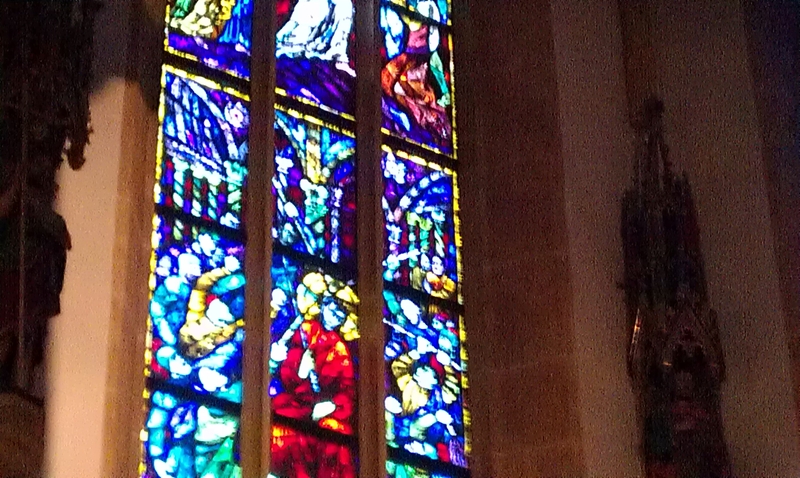 Im mittleren rechten Fenster in der Stadtpfarrkirche hat der Künstler Hitler und Mussolini verewigt