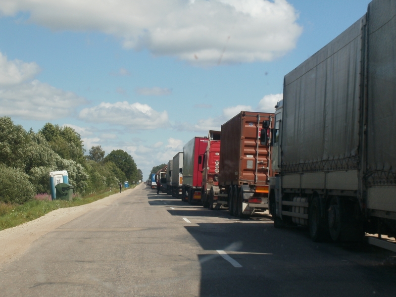 Wir fuhren durch Malta (sic!), kurz später in Rēzekne gab es kühle Getränke und zu Mittag Hot Dogs von der Statoil (einfach die beste Adresse dafür!). Dann standen schon die Schilder: „Borderland“. Wir erreichten die russische Grenze um 12.30 Uhr, nachdem wir an mehreren Kilometern LKW-Schlange vorbeigefahren waren. Nur wenige PKW vor uns. Eine Ampel zeigte an, wenn ein Auto oder LKW in den Grenzkomplex fahren durfte. So langsam wurde es ernst mit unserer allerersten Rußland-Einreise.