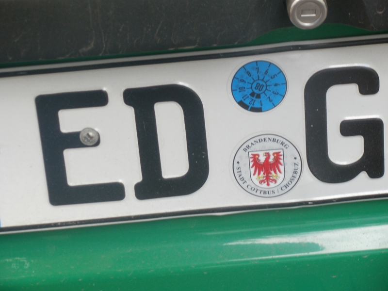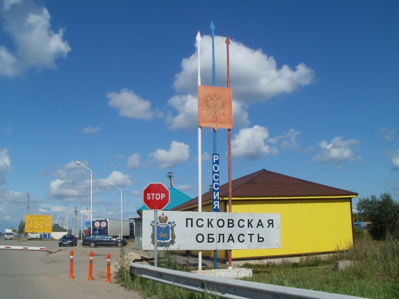 Wir kamen schnell an die Reihe. Die lettischen Zöllner waren recht ruppig, nahmen ihre Sache aber nicht genau und ließen uns nach der üblichen „Kofferraum-auf-zu“-Einlage weiter fahren. Um 13 Uhr war bei km 396.106 die Ausreise aus der EU erledigt. Wir stellten uns im Niemandsland hinter 10 Autos an, die Grenzsteine wenige Meter vor uns fest im Blick. Wir stellten in der Wartezeit schon einmal die Uhren eine weitere Stunde nach vorn (MESZ+2). Hätte Rußland die Sommerzeit nicht zur Normalzeit erklärt, wäre es noch eine mehr gewesen. In der Schlange trafen wir eine deutschrussische Familie aus Thüringen, mit der wir uns kurz unterhielten.