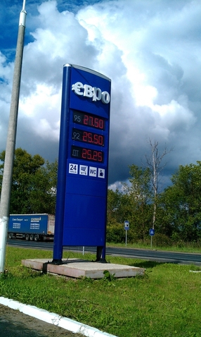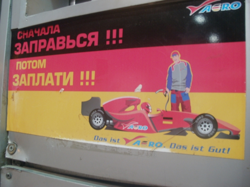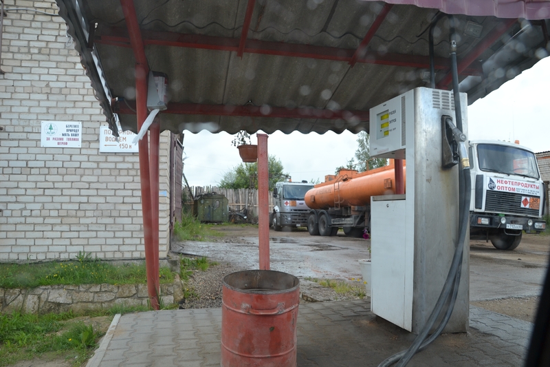 Ich wedelte mit einem 10-Euro-Schein, doch „Ewro njet!“. Erst der Mann rechts neben mir löste die Situation, in dem er die 10 Euro in 400 Rubel wechselte, obwohl sie nur 390 wert gewesen wären. Erst dann ging die Schranke auf und wir konnten in die Weite Rußlands hinaus fahren. Die Tanke direkt am Grenzkomplex ließen wir aus, da die Erfahrung lehrt, daß es an den Grenzen immer am teuersten ist. Die sowjetische Nationalhymne in der Version von 1977 erklang gerade aus den Boxen, als wir 20 Kilometer nach der Grenze einem Schild zum „Dizel“ folgten. Es war mehr ein Bauernhof als eine Tankstelle, aber hier versteckte sich tatsächlich ein zierliches Mädel hinter Panzerglas, um meine 100 Rubel anzunehmen und die Säule freizuschalten. Unfaßbare 3,7 Liter bekam ich dafür. Ein Literpreis von 0,676 EUR /L. Mit der Szenerie drumherum totaler Kulturschock.