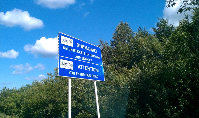 Um 16.15 Uhr russischer Zeit waren wir fertig. Eine halbe Stunde auf lettischer, 2 1/4 Stunden auf russischer. Nun hätten wir fahren können, wäre da nicht eine letzte Schranke gewesen. Neben ihr stand auf einem Schild „You enter paid road.“ „Toll!“, dachten wir im Scherz, „Wenn die Straße schon bezahlt ist, ist ja alles in Ordnung!“. Doch die Schranke wollte nicht aufgehen. Ich ging in das Kabuff links und fragte nach. „Trista rubli!“ sagte die Frau hinter dem Panzerglas. 300 Rubel, wohl die Maut. Ich hatte noch nie von einer Maut in Rußland gehört. Desweiteren hatte ich auch keine Rubel. Ich war schließlich noch nie in Rußland, und zum Geldverbrennen muß ich für gewöhnlich nicht bei meiner Hausbank Fremdwährung kaufen, sondern nehme einfach ein Feuerzeug.