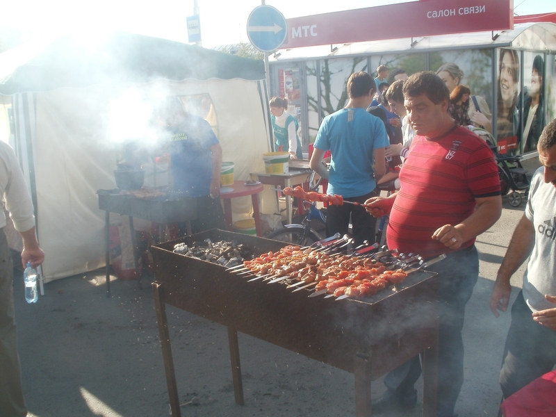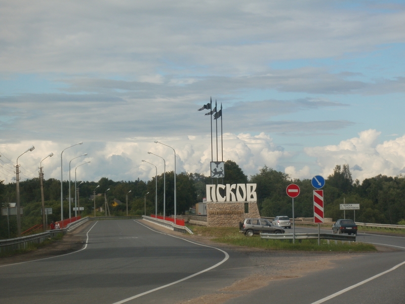 Kurz darauf erreichten wir Pskov. Dort war gerade Volksfest. Entweder ziehen wir sie magisch an, oder man feiert halt gern dort, wo wir hinfahren. Wir stellten das Auto ab und aßen unser erstes Schaschlik zu Abend. Die Sonne stand noch so hoch am Himmel, daß es uns gerade einmal wie früher Nachmittag vorkam.