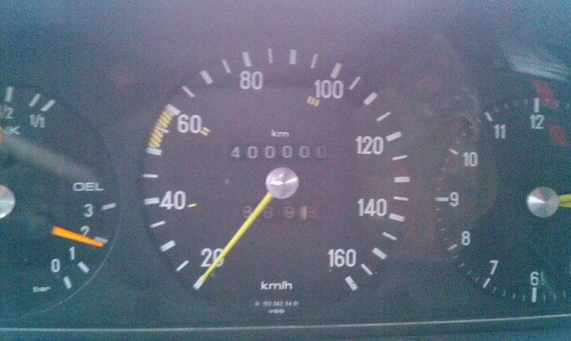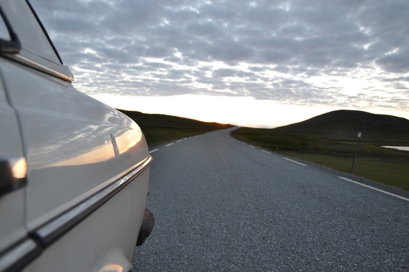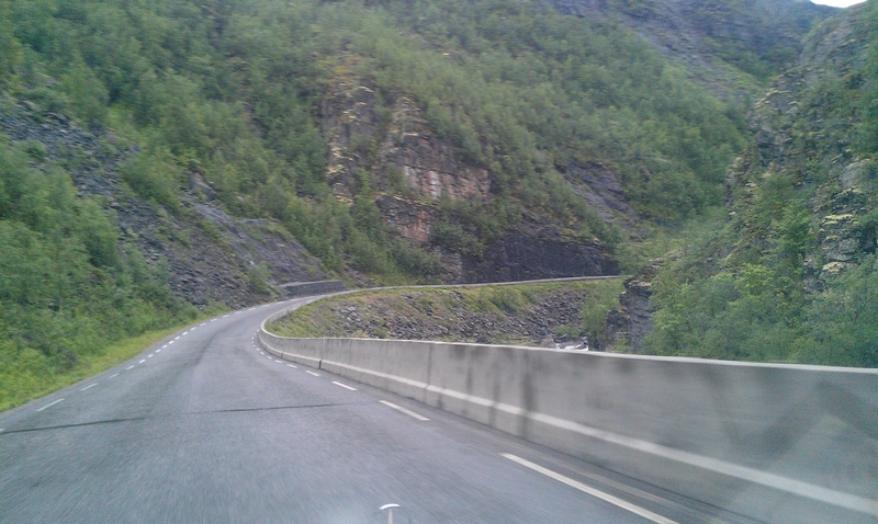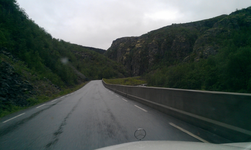 Nonstop erreichten wir wieder das Festland und bogen in Richtung Alta ab. Dort war ich noch nicht. Wir hatten die Strecke so gewählt, daß es nicht viel Umweg, aber viel Neuland für mich als Hauptfahrer ist. Hammerfest ließen wir tatsächlich rechts liegen. 40 km vor Alta näherten wir uns dem Kilometer 400.000. Wir erreichten ihn mitten im Nirgendwo, um 3.15 Uhr bei Koordinaten 70.17121° N, 23.77240° E. Kurz vorher hatten wir ein paar Schneeflocken im Nieselregen gesichtet. Wir gaben dem Auto eine Bierdusche, die es sich redlich verdient hatte. Sekt war leider nicht zur Hand.