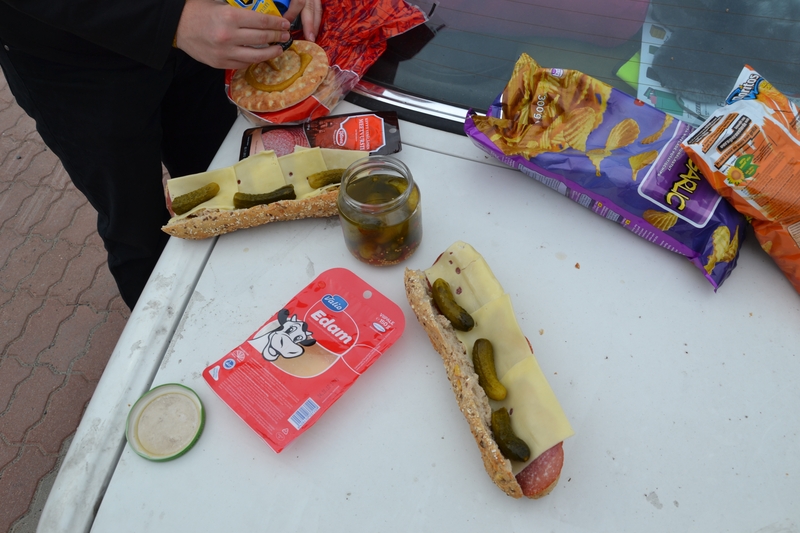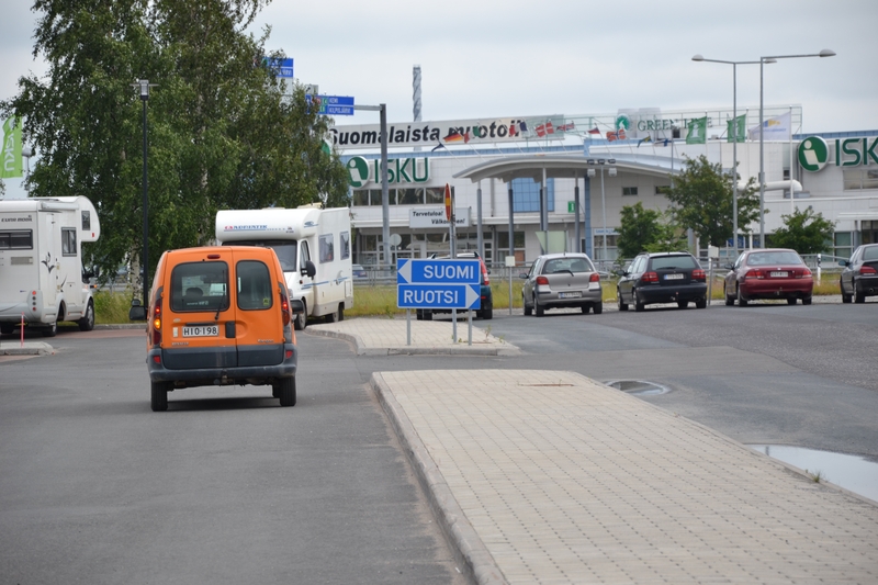 Wir fuhren noch einmal nach Schweden um im großen coop-Supermarkt einzukaufen. Außerdem hatten wir dort WLAN, das wir auf dem Camping vermißten. Cider und schwedische „Kex“-Schokolade gingen für mich mit. Dann hielten wir noch am Einkaufszentrum Rajalla/På Gränsen (An der Grenze). Es war wirklich genau an der Grenze gebaut und lag wohl noch in Finnland, soweit sich das erkennen ließ. Wir kauften noch Brot, Käse, Wurst und Gemüse und aßen auf dem Parkplatz ein Frühstück. In Sichtweite war eine finnische Polizei- und Zollkontrolle, die sie genau nach unserem Übertritt aufgebaut haben mußten.