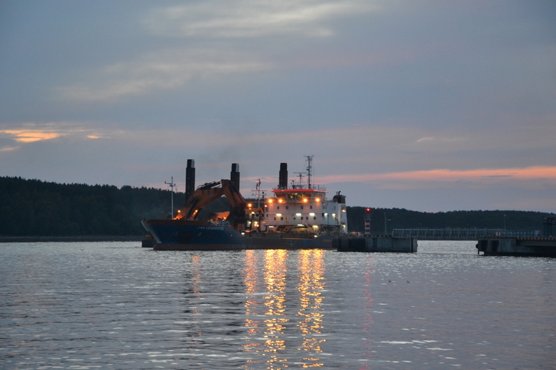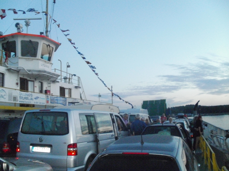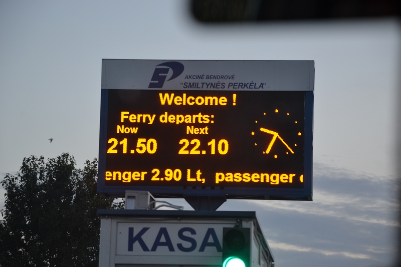 Zurück in Klaipėda suchten wir den Fährhafen auf die Kurische Nehrung zunächst wegen schlechter Ausschilderung vergeblich. Das Navi hatte irgendwie eine veraltete Adresse. Als wir da waren, atmeten wir auf. Trotz der späten Stunde fuhr die Fähre noch im 20-Minuten-Takt. Wir kauften das Ticket für 21.50 Uhr (45,80 LTL, umgerechnet 13,20 EUR). Die Überfahrt war schnell erledigt, es waren ja nur wenige hundert Meter. Wir mußten noch irgendeinen Kleckerbetrag Maut für die Befahrung der Nehrung bezahlen. Karten nahmen sie nicht, und sonst nur Mickeymaus. Unter wütendem Getobe nahm der schwer übergewichtige Mautschrankenbediener 200 Rubel ersatzweise an und ließ uns passieren.