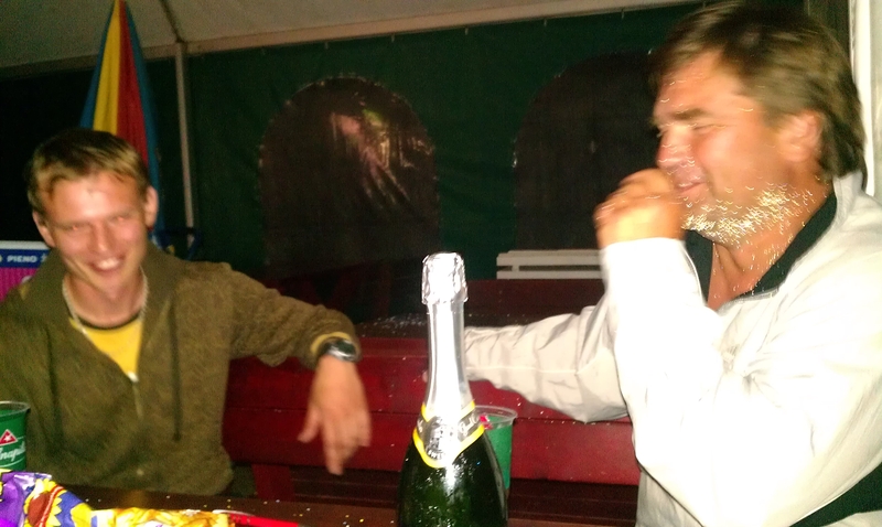 Überall standen „Camping verboten“-Schilder. Doch wo sollten wir nun schlafen? Wir wollten sicher nicht wieder von der Nehrung runter fahren. Nach etwas Suche landeten wir an einer Sackgasse am Deich (Koordinaten 55.67767° N, 21.10436° E). Es standen schon ein paar Wohnmobile und Autos, in denen Leute schliefen, herum. Wir fragten an der Bar, die recht einsam in der Gegend herum stand, nach. Der Barkeeper bestätigte uns, daß es niemanden interessiere, wenn wir hier unser Zelt aufstellten. Als das erledigt war, gönnten wir uns beim redseligen Litauer, der gut Englisch sprach, das eine oder andere. Ein zweiter älterer Litauer kam etwas später auf dem Fahrrad hinzu. Er suchte seinen Kumpel, mit dem er auf Radtour war. Wir hatten ihn auch nicht gesehen. Da er ihn auch nicht auf dem Handy erreichte blieb er einfach da und trank mit. Ihm gehörte wohl das „Teatro Buffetas Kafe“ in Šiauliai, das er uns aufschrieb, und er bat uns mehrfach, ihn mal besuchen zu kommen, wenn wir wieder in der Gegend sind. Der Keeper stellte uns eines nach dem anderen hin. Als wir zahlen wollten winkte er ab. Ich gab ihm 10 EUR, das war für ihn sehr in Ordnung.