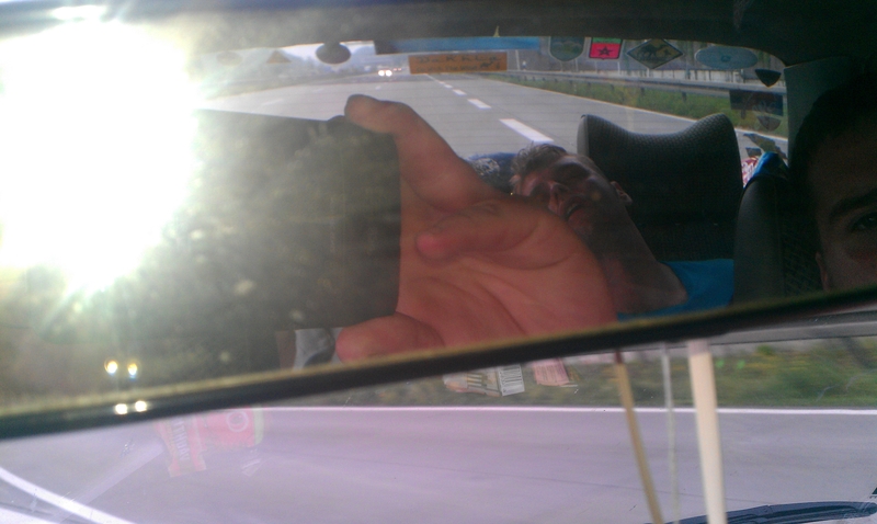 Wir gingen nach dem Tanken (39 l, 1,459 EUR /L) noch auf ein kleines Berliner Frühstück. Dann waren wir am Treffpunkt. Gleichzeitig mit Jonas' Verabschiedung stiegen die beiden am S-Bahnhof Neukölln zu. Sie erzählten noch kurz, daß sie gerade aus dem Berghain kämen, von wo sie die Mitfahrt reservierten, und ziemlich fertig wären. Kurz darauf waren sie beide weg gepennt.