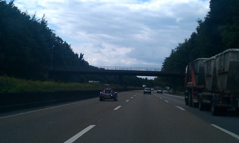 Bei Magdeburg machten wir Pinkelpause. Ich sah nach Ewigkeiten mal wieder nach den Reifen. Sollte ich wohl mal wieder öfter machen. Hinten rechts hatte sich ein Teil der Lauffläche abgelöst. Ich sagte den beiden Mitfahrern, daß wir den Reifen wechseln müßten, „Aber keine Sorge, ich habe Ersatz auf dem Dach.“ „Ja, kein Problem, dann rauchen wir jetzt erst mal eine Tüte.“ Ja bitte, warum nicht.