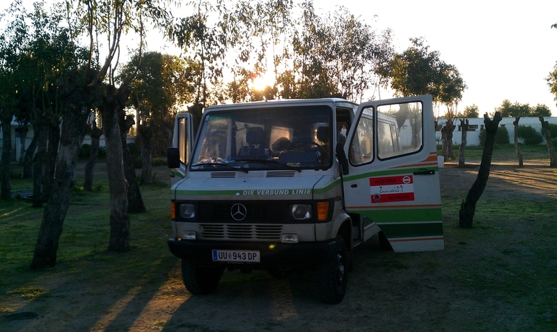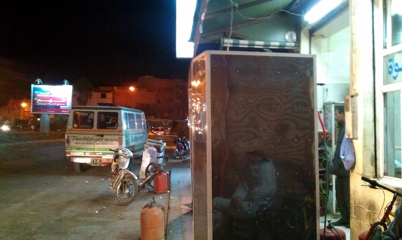 Um 19.30 erreichten wir Guelmim, wo wir zu Abend essen wollten. Am Place Bir Anzarane, an dem ich letztes Jahr schon Mittag aß, setzten wir uns an einen der zig Hendlbratereien. Wieder dauerte es nicht lange, bis wir gefragt wurden, ob wir etwas zu verkaufen hatten. Ich war vorbereitet. Nach zähen Verhandlungen wurde ich einen Haufen in Deutschland wertlosen Elektronik- und Autoschrott für ziemlich genau 50 EUR los. Die drei Portionen Hendl kosteten insgesamt läppische 65 MAD.