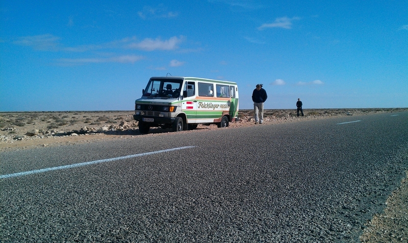Um 17 Uhr, kurz vor Dakhla, dem Tagesziel, wurden wir an einer Tankstelle von der Polizei rausgewunken. Ich war mir keiner Schuld bewußt, ahnte aber schon, daß man uns irgendetwas vorwerfen würde. Zunächst einmal wurden Führerschein und Fahrzeugschein, damit man etwas als Druckmittel in der Hand hat. Der Polizist redete auf Französisch auf mich ein, ich gab vor, nicht das geringste zu verstehen. Er bat mich aus dem Bus und zu sich an den Posten. Er malte mir auf: „68 km/h“. Daneben: „300 DH“. Das mit den 68 km/h kann sein, aber ich konnte mich an kein Schild erinnern. Außerdem ist hier weit und breit nichts, was 60 km/h rechtfertigen würde. Ich blieb stur, sprach nur Deutsch mit ihm, und bat ihn, mir das Schild zu zeigen. Das konnte er nicht. Er steckte meinen Führerschein in seine Aktentasche und sagte auf gebrochenem Englisch, ich müsse ihn mir dann in Dakhla bei der Polizei abholen. Daraufhin wurde ich lauter und forderte ihn auf, mir sofort meinen Führerschein zurück zu geben, da er mich offensichtlich ohne Grund fest hielt. Nach 10 Minuten Diskussion, in der er mich locker hätte zum Schild fahren können, wenn es denn existiert hätte, gab er ihn mir zurück, nicht ohne mir hinterher zu rufen: „You can't exit Morocco without pay!“.