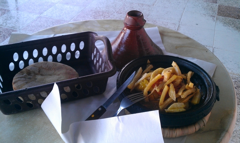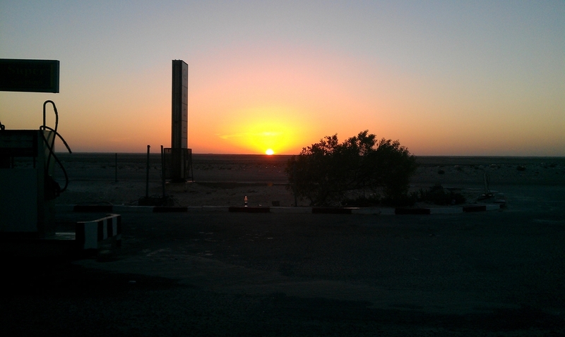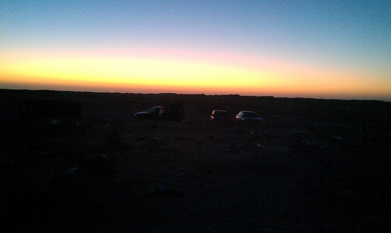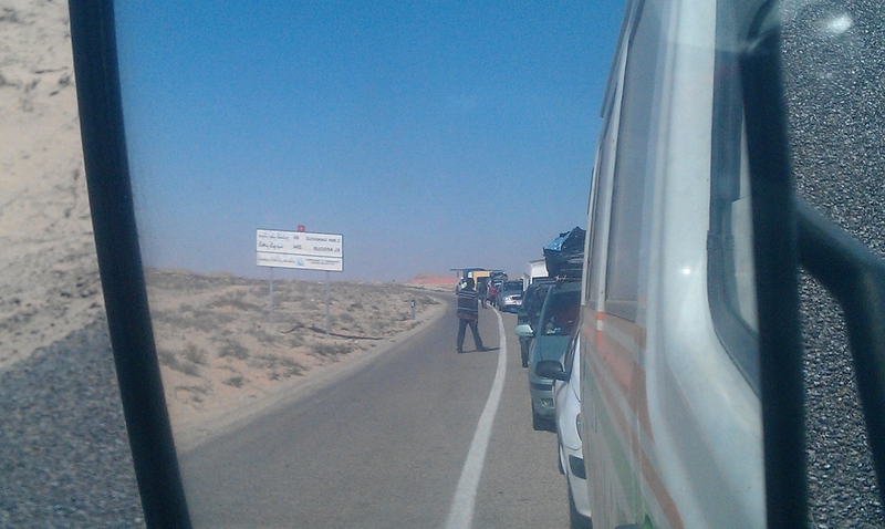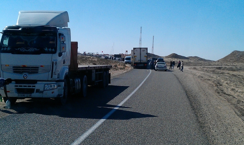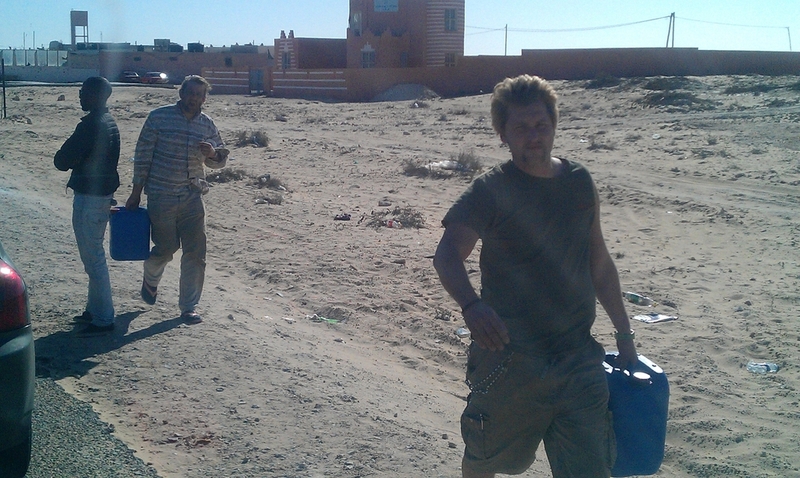 Ob wir es heute überhaupt noch schaffen würden? Eine Nacht am Minengürtel oder im Niemandsland braucht man nicht unbedingt. Die Tramper wurden von den Norwegern mitgenommen und mit den Briten verabredeten wir uns, gemeinsam durch das Niemandsland zu fahren. Denn im Gegensatz zu ihnen kannten Blondie und Lummi die Strecke schon. Es schien langsam vorwärts zu gehen. Eine halbe Stunde nach der letzten Zählung waren es „nur noch“ 64 Autos vor uns, darunter ein Porsche Cayenne und 6 (!) Heidelberger Kurzzeitkennzeichen. Wir tranken einen Tee und ich aß ein Lammtajine für günstige 40 MAD. Dann holten wir von der Tankstelle direkt an der Grenze noch zwei Kanister, die wir gut versteckten.