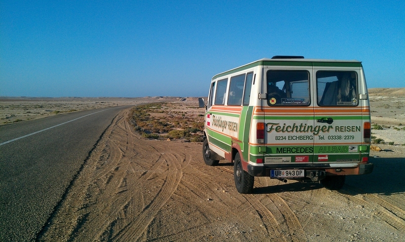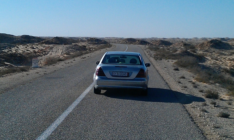 Das war einfach atemberaubend. 5 km Land, das niemandem gehört, das auch niemand haben will, und überall Müll und geschlachtete Schrottautos. Dazwischen Händler, die hier zu leben scheinen. In dem Ausmaß soweit mir bekannt einmalig auf der Welt. So mancher leichtsinnige Tourist, der sich im Gewirr der Pisten verloren hat, hat schon Bekanntschaft mit einer Mine gemacht und ist tot geblieben. Mittlerweile war die Hauptpiste aber breit wie eine Autobahn ausgefahren und wir mußten nur den Schwarzen hinterher fahren, die das hier wohl mehrmals im Jahr machen. Die Briten immer stramm hinter uns.