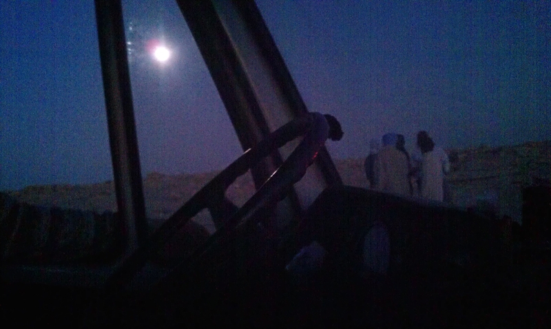 Zunächst überreichte Lummi das Essenspaket, das er für wenige Euro bei Aldi zusammengestellt hatte. Der Zöllner lachte. Keine Bestechung, einfach nur eine kleine Zuwendung für die armen Beamten, die hier Schicht schoben. Es zahlte sich aus. Ein Deutscher Schäferhund, der wahrscheinlich nur auf Leckerlis ansprang, wurde zur Abschreckung durch den Bus gejagt. Dann die Fragen: „Alcohol? Beer?“ Natürlich nicht. Um 20.54, nach 12 Minuten, wären wir mit der Zollkontrolle fertig. Wir fuhren vor die nächste Schranke. Es mußte eine Zoll-Ehrenerklärung ausgefüllt werden, die ganz offiziell 10 EUR kostete. Mit ihr gaben wir unser Ehrenwort, ich wiederhole: Unser Ehrenwort, das Auto in Mauretanien nicht zu verkaufen. Zurück auf der Straße kassierte ein abgehangener alter Maure 500 Oguya Gemeindesteuer. Hatten wir nicht, 2 EUR waren auch in Ordnung.