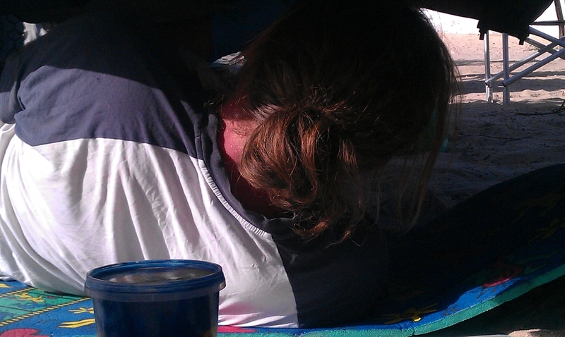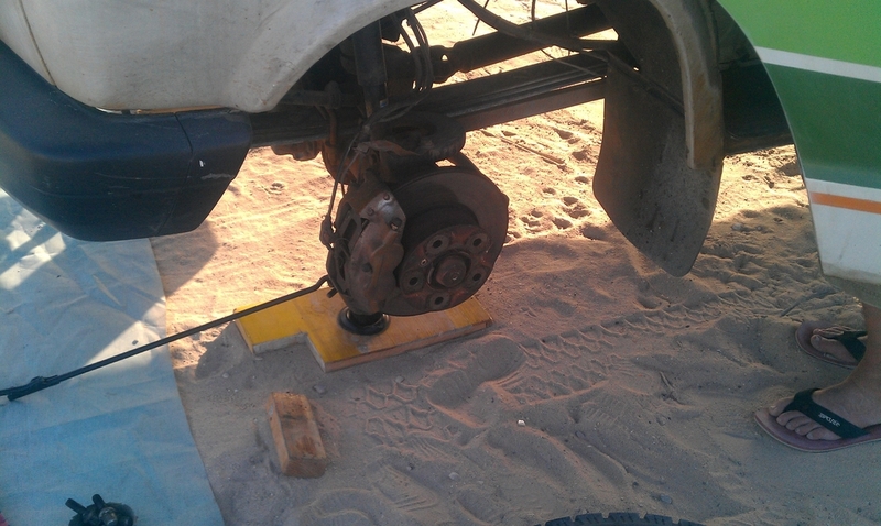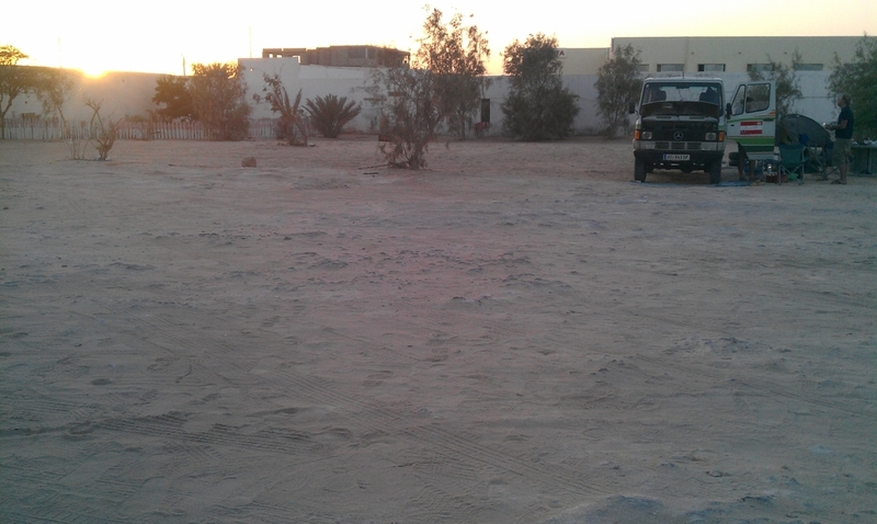 Um Viertel vor 12 wachte ich auf. Abda, der Chef des Campingplatzes Abba, kam vorbei und begrüßte uns herzlich. Lummi servierte bestes Baguette zum Frühstück und legte sich kurz danach unter den mittlerweile aufgebockten Bus, um nach dem Geräusch zu suchen. Es war schnell gefunden: Das Kreuzgelenk am Verteilergetriebe. Wenn das bricht, dreht die Welle frei und ist am Sack. Und da es eine Spezialanfertigung ist, wie eigentlich der ganze Bus, ist die verbaute Welle wahrscheinlich die einzige in ganz Afrika. Fuck!