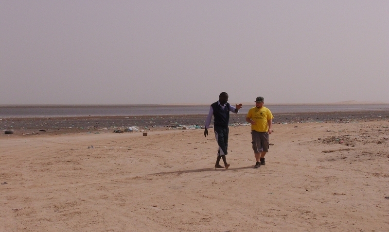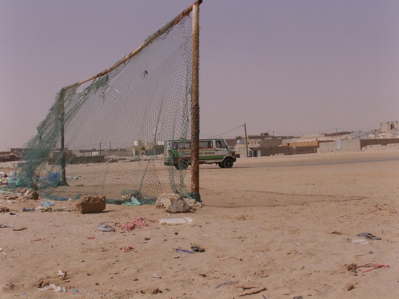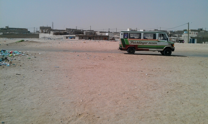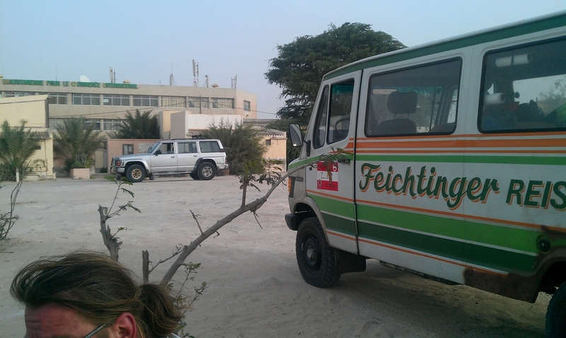 Bei Western Union wollten sie weiterhin nur für 360 UM /EUR tauschen, also ging ich unverrichteter Dinge zurück zum Campingplatz. Dort war gerade ein Freund von Abda unterwegs. Ibrahim hieß er und er gab zu verstehen, daß er uns alles besorgen könne. So tauschten wir erst mal Geld zum Kurs von 385, dann kaufte Blondie eine mauretanische SIM-Karte, die Ibrahim innert 10 Minuten zu Fuß beschaffte und wir gaben zwei Sätze mauretanischer Nummernschilder als Andenken in Auftrag. Sie kosteten 12.000 UM pro Satz, sicher ein Touristenpreis, aber das war das ganze wert. Wir fragten Ibrahim, ob er uns zum Cap Blanc, dem Schiffsfriedhof in der Bucht von Nouadhibou bringen könnte. Er verneinte, organisierte uns aber einen Guide für eine kleine Rundfahrt. 30 EUR sollte es für den gesamten Tag kosten. Eine Win-Win-Situation, für Ibrahim und seinen Freund ein gutes Geschäft, und für uns sind 10 EUR p. P. keine wirkliche Investition. Also auf.