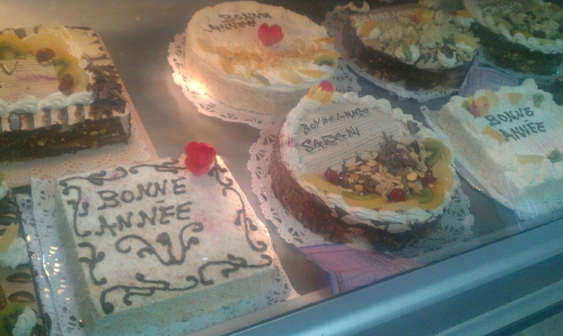 Lummi war nach getaner Arbeit hungrig, und so gingen wir zum Mittagessen die Straße runter. Im Restaurant Vollmond (Pleine Lune) gab es „Humbourger“, Pommes und Fritten für alle, insgesamt 7300 UM. Die ganzen „Bonne année!“-Küchlein waren zwar ganz süß hier in dieser trostlosen Wüstenstadt, taten mir aber leid, weil sie keiner kaufte.
