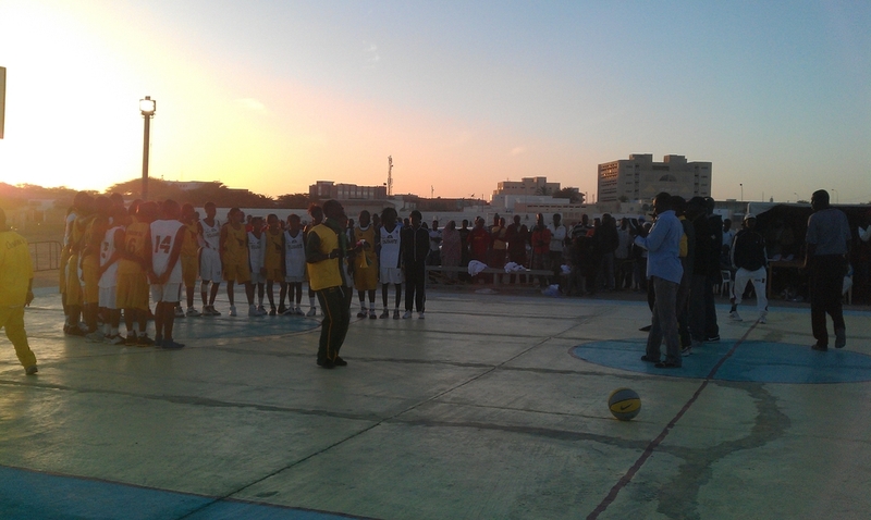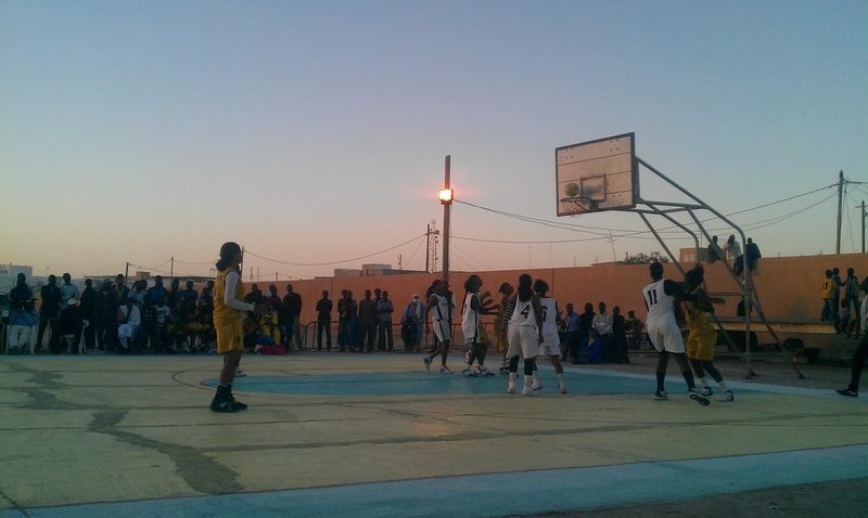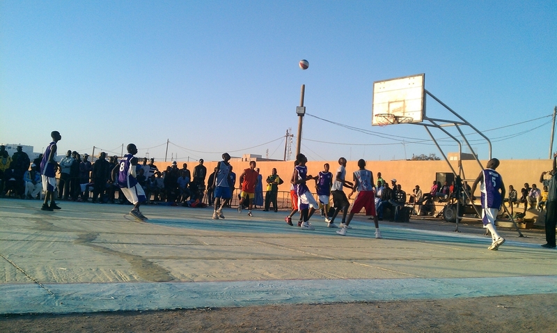 Zurück auf dem Campingplatz hatte ich gerade den Laptop aufgeklappt, als Abda vorbei kam und etwas von einer „Party“ erzählte. Ganz verstand ich ihn nicht, meine Französischkenntnisse hatte ich ja schon erläutert. Ich dachte jedenfalls, es ging um Silvester, und so kamen wir mit. Er lief uns voraus und so erreichten wir das städtische Stadion. Dort war aber nichts von „Party“, sondern ein Basketballturnier zu sehen. Nicht irgendeines, sondern die Mannschaft des Waisenhauses, das er gemeinsam mit Florian von der Dust-and-Diesel-Rallye aufgebaut hatte, trat heute dort an. Die Zuschauer waren außer sich, es war riesige Stimmung, dazu ging ständig mauretanischer Tee rund. Es war toll zu sehen, wie viel Spaß die Kinder hatten. Die Mädchen waren genauso wenig verhüllt wie die Zuschauerinnen in diesem „geschützten Raum“, trotzdem nahm keiner Anstoß an uns „Weißen“, sondern wir waren integrierter Teil der Veranstaltung. Als wären wir Einheimische. Die Trainerin der Frauenmannschaft aus Nouakchott sprach uns an, sie sprach sehr gutes Deutsch, obwohl sie vor einigen Jahren nur 6 Monate in Deutschland gelebt hatte, und zwar in Darmstadt und - jetzt kommt's - Wiesbaden.