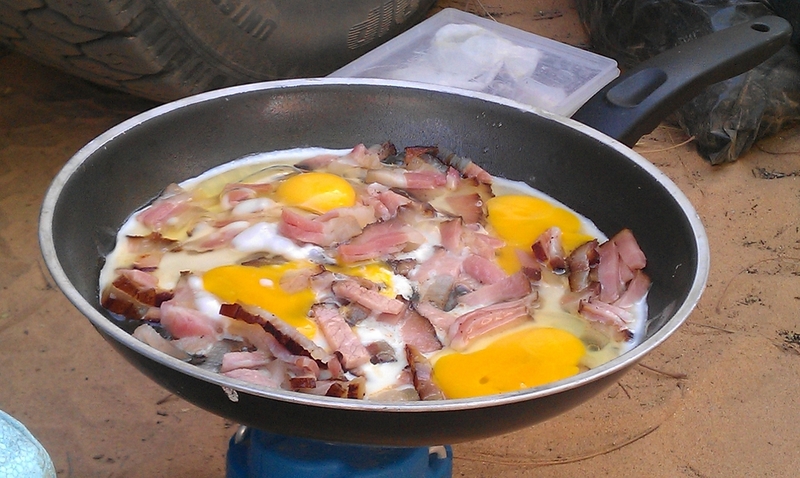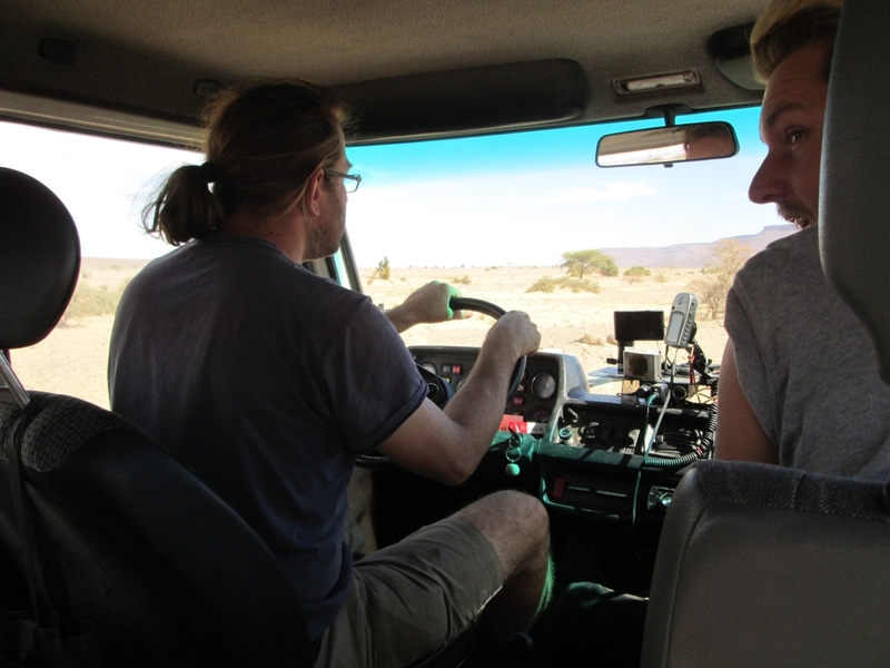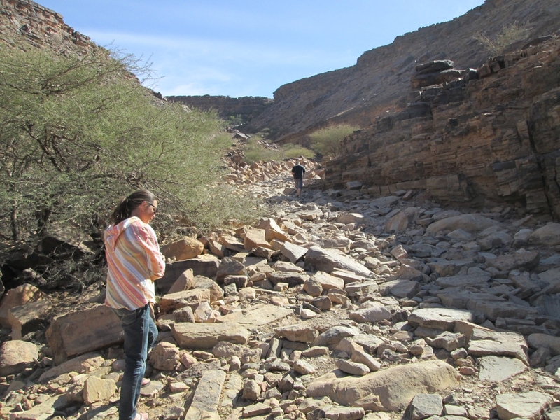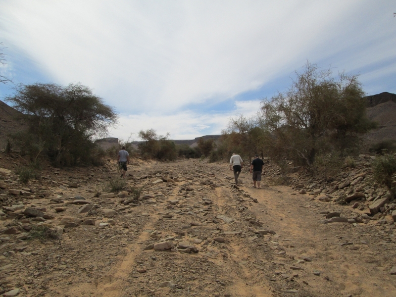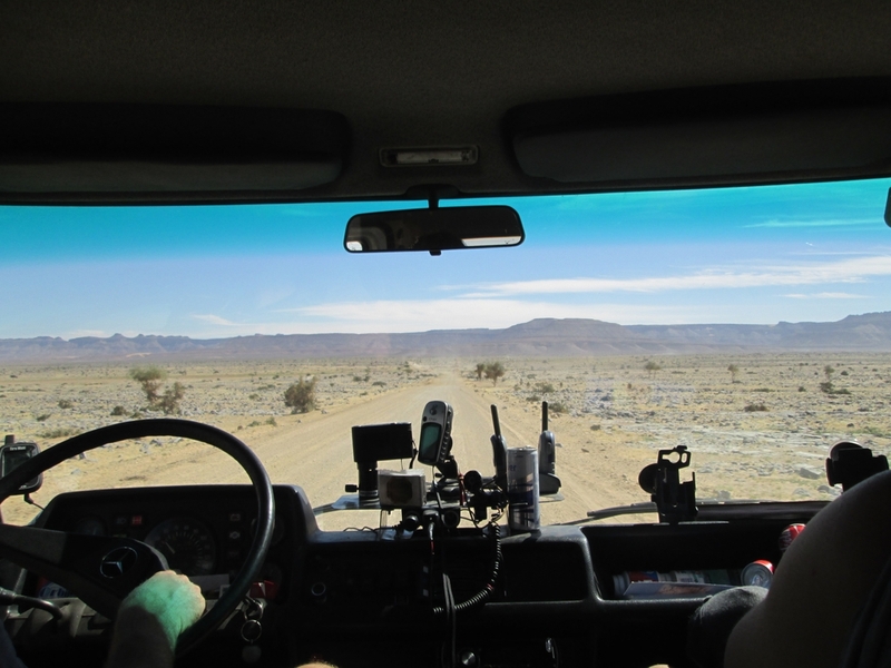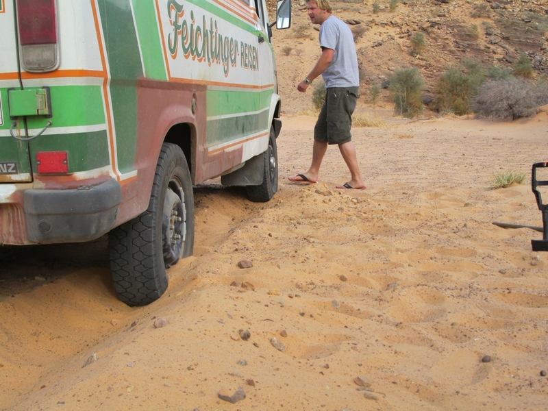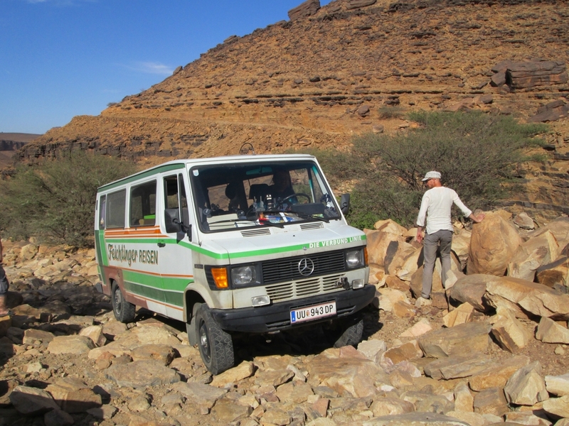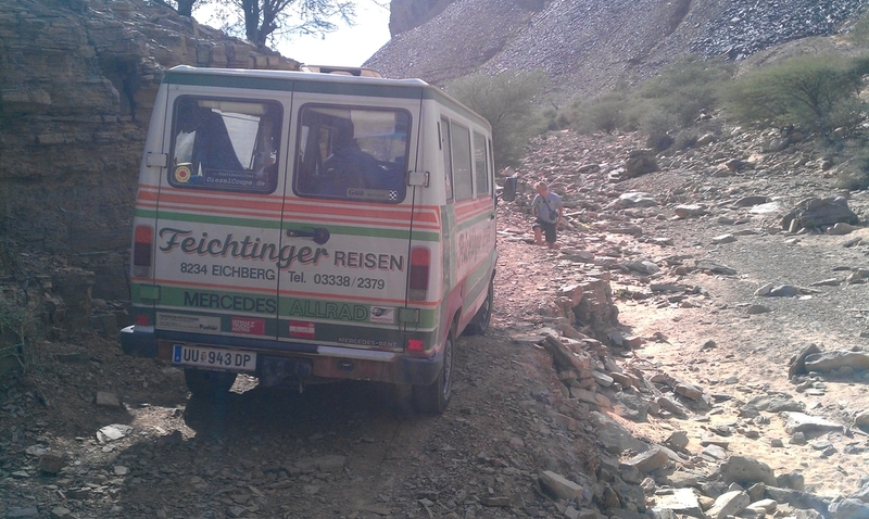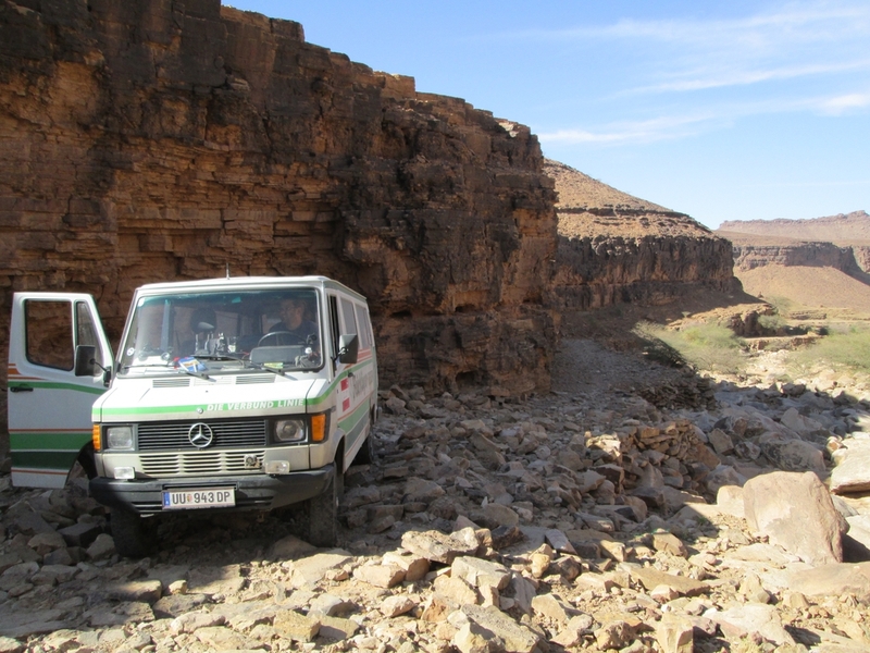 Nach einer langen leichten Pistenpassage ohne Sandfelder wurde es kniffliger. Wir hatten sowohl Engstellen zu überwinden als auch ein Wadi, in dem wir uns galant festfuhren, weil wir uns auf ein Feuer konzentrierten statt auf die Piste.