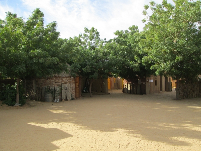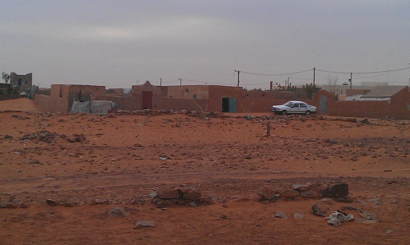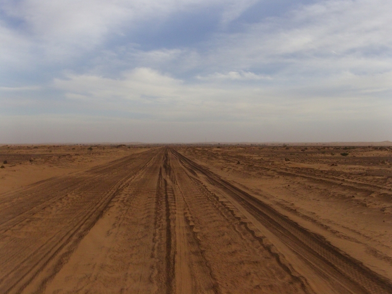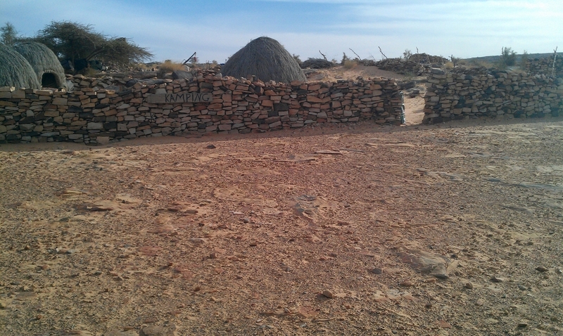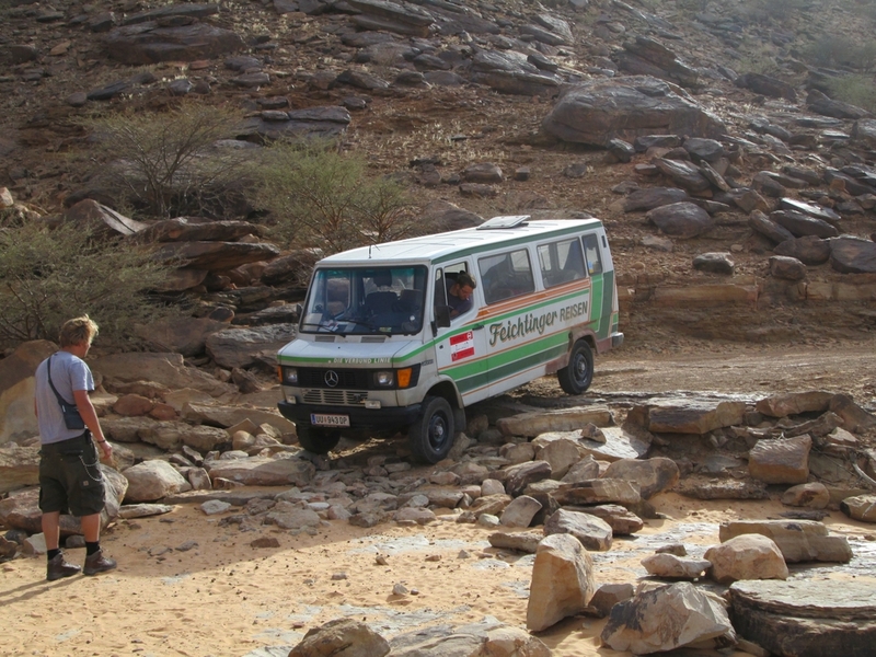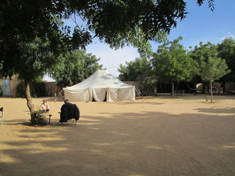 Mit 30-40 km/h schoben wir uns nun über das Wellblech nach Chinguetti. Früher eine der heiligen Stätten des Islams wird sie nun leider vom Sand aufgefressen. Mit diesem auch die wertvollen islamischen Bibliotheken. Ich konsultierte den Kohlbach-Führer auf ein Neues. Er empfahl den Platz „L’Eden“ zur Übernachtung, gleich am Ortseingang. Die Zimmer dort waren zu teuer, der Platz zum Campen zu schäbig, der Besitzer etwas unmotiviert. So zogen wir weiter. Bald sahen wir ein Schild „Camping 2008, 100 m links“. Lummi war ungläubig, doch der Platz, der in Wirklichkeit „La Rose des Sables“ hieß war sehr nett gemacht und auch der Chef freundlich und englischsprachig. Hier bleiben wir. Die Tramper nahmen ein Zimmer, Lummi und Blondie Platz im Nomadenzelt und ich wie immer im Bus. Koordinaten: 20°27.833' N, 12°21.878' W.