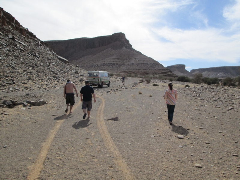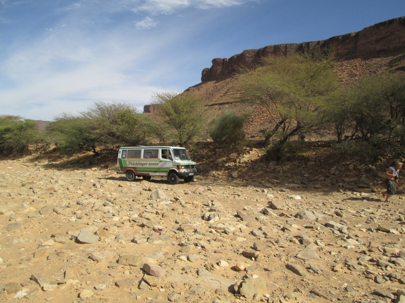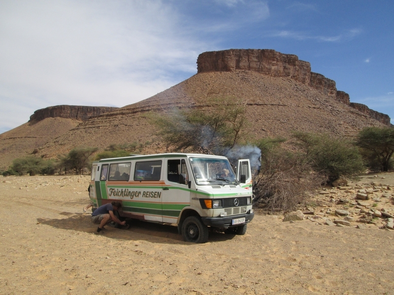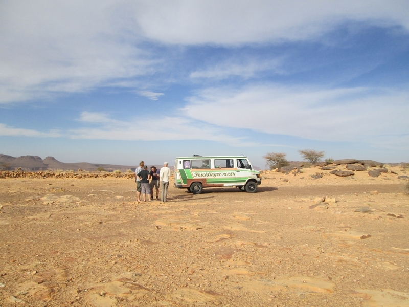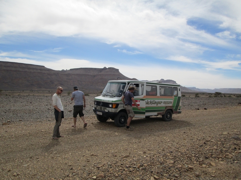 Um halb 11 war Aufstehen angesagt. Lummi und Blondie waren schon in Justs Werkstatt, um noch einmal nach dem Kreuzgelenk zu sehen. Es wurde für gut befunden, Just sagte, er hätte schon deutlich schlimmere gesehen. Wir frühstückten mit den Trampern. Dabei ergab sich irgendwie, daß sie heute genau wie wir nach Chinguetti fahren wollten. Wieso sollten wir sie also nicht mitnehmen? Wir nahmen nur nicht die Hauptstraße, sondern wollten den alten Paß fahren. Aber das war ihnen gerade recht, so sahen sie mal was anderes.
