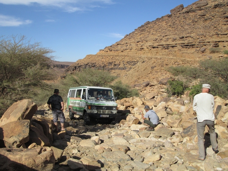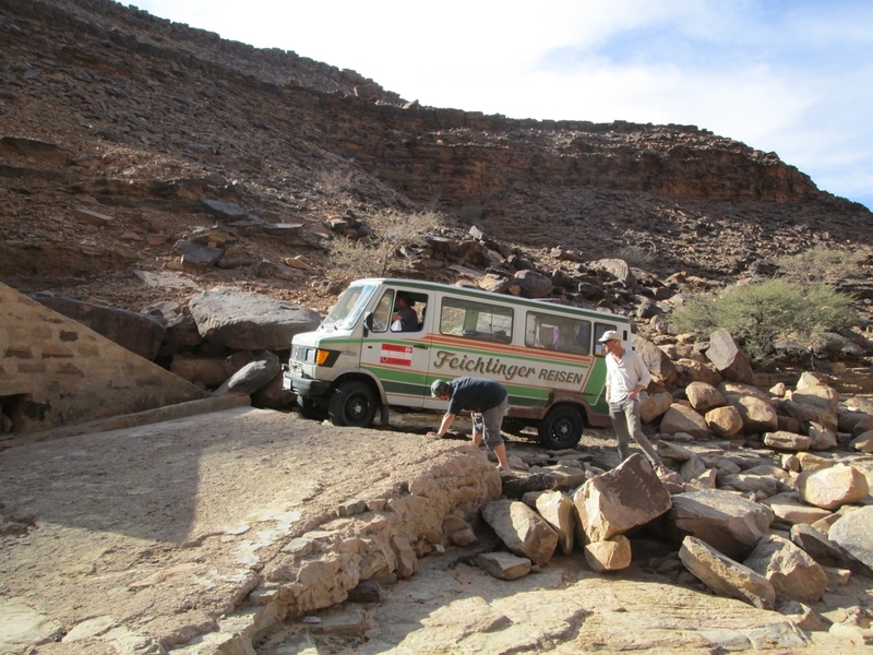 Dann wurden die Brocken immer größer, bis es zur Farce wurde. Die Reifen wurden mit dem Kompressor auf 3,3 bar vorne und 3,7 hinten aufgepumpt, um nicht zerstochen zu werden. Dann bauten wir uns die Piste selbst, zum Glück waren wir ja nun zu fünft.