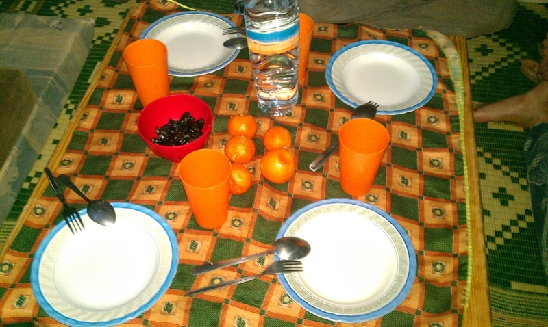 Während der Dauerbeschallung durch den Muezzin orderten wir ein vegetarisches Abendessen, das nicht besonders exquisit ausfallen sollte, aber trotzdem satt machte. Maccaroni mit Gemüse, Orangen, Datteln und Tee. Der Chef des Platzes gab sich große Mühe, seine Gäste zufriedenstellend zu versorgen.