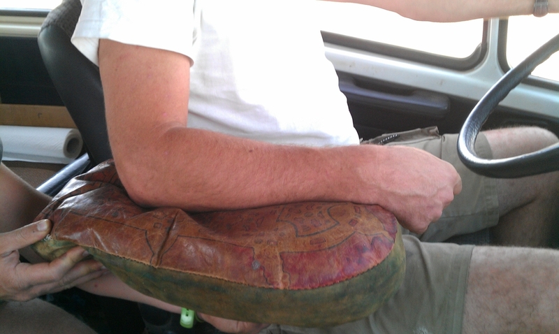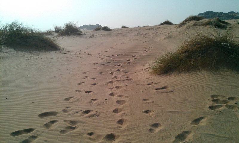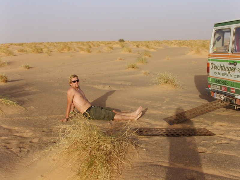 Wir bogen von der Hauptstrecke ab, schalteten als die ersten Dünen kamen den Allrad ein und gaben Gas. Nach einem guten Stück, das auch prima lief, sandeten wir aber vollends ein. Vor uns nur Weichsanddünen. Wir mußten mehrere male hintereinander graben, Lummi fuhr dann auf die nächste feste Stelle und Blondie und ich mußten die vier jeweils 20 kg schweren Bleche hinterherziehen/-tragen.