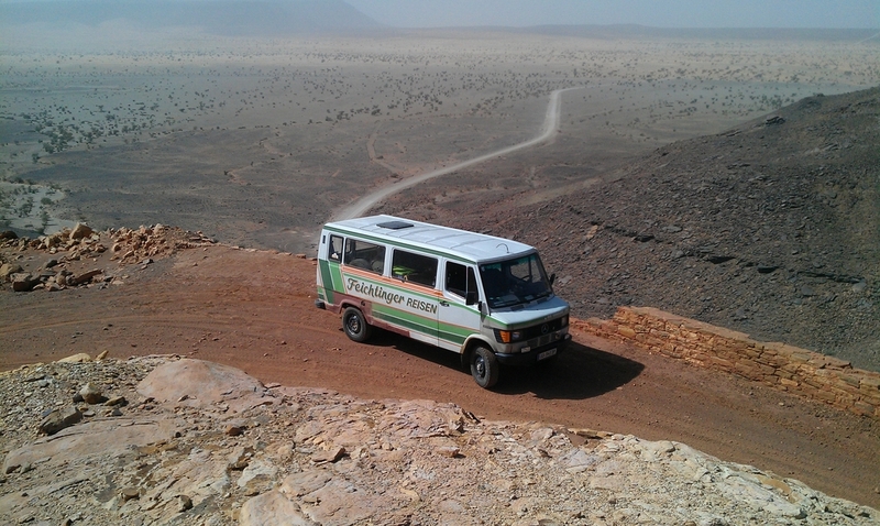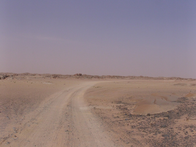 Nach dieser wirklich wunderbaren Aussicht fuhren wir vorbei am in Fachkreisen bekannten Fliegenproblemzöllner herab ins Tal, es folgte eine harte Piste, die wir oft nicht direkt befahren konnten, sondern die Ausweichpisten links und rechts davon nehmen mußten. Lummi hatte einen GPS-Track dabei, der von dieser Piste nach Choum ab querfeldein zum Ben Amira führte. Der Track war von Motorradfahrern, Lummis Schluß war daher: Was Motorräder schaffen könnten wir auch schaffen.