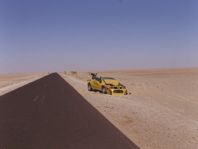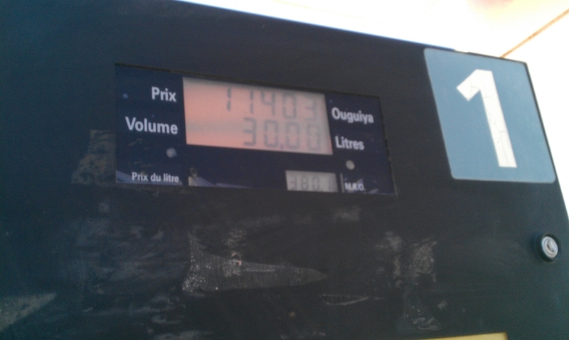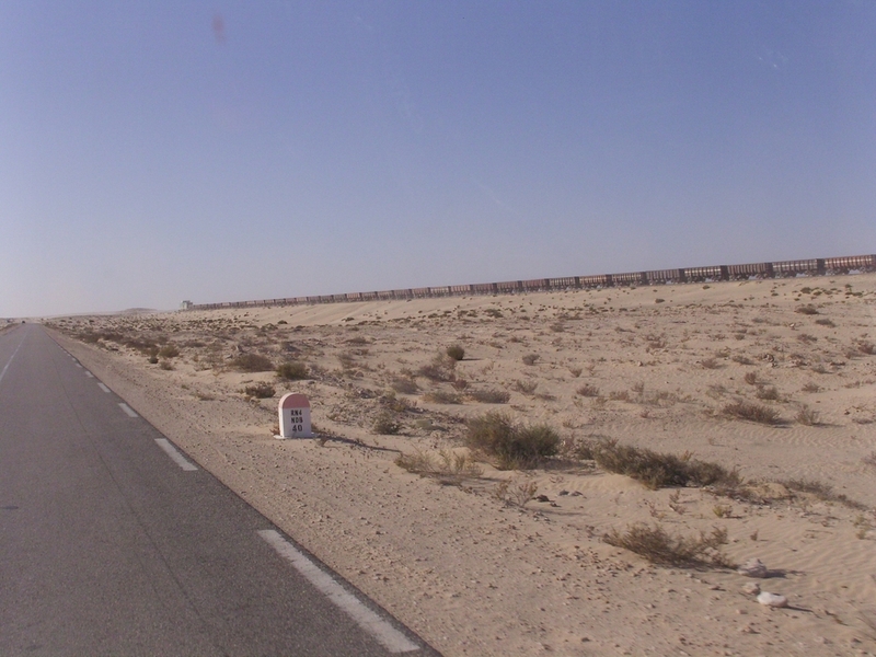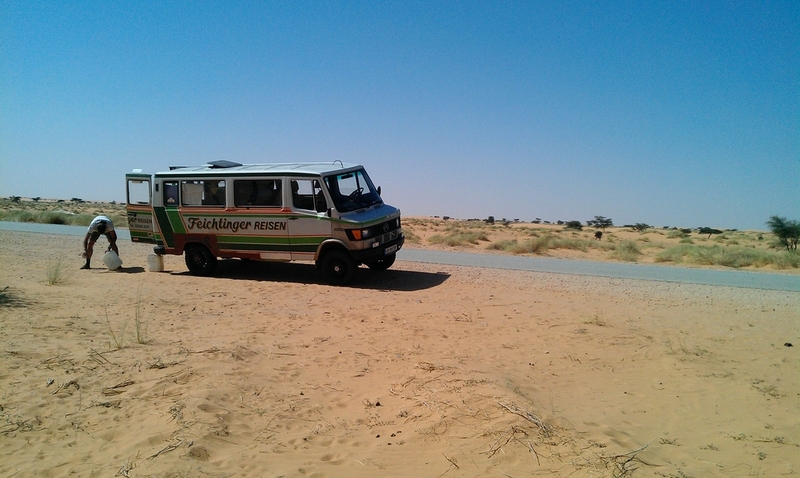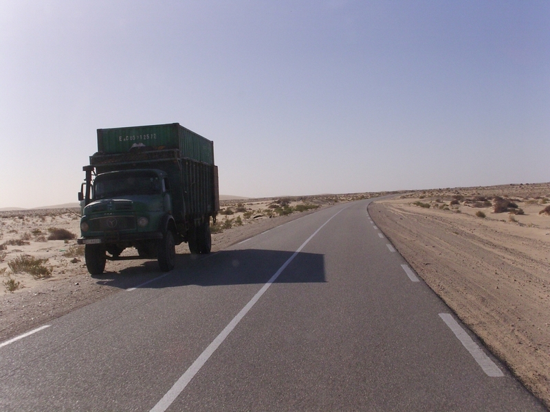 Nach 3,5 Stunden auf der Straße, knapp hinter der Hälfte der Strecke, war der Tank leer. Wir hatten noch die Kanister aus der Westsahara, die wir bislang aus Sicherheitsgründen nicht angerührt hatten. Die restliche Strecke in Mauretanien war berechenbar. Nun konnten sie daher „einiglaart“ werden, wie Lummi sagte. Es würde nicht bis zur ersten westsaharischen Tanke an der Grenze reichen, daher mußten wir noch 30 L (11.500 UM, km 239.437) an der Tankstelle Chami, bei km 203, nachlegen. Im „Tankstellenshop“ hatte ich eine erste wirklich direkte Begegnung mit einem Verkäufer, der Analphabet war. Ich sollte ein Packung Kekse mitbringen, benannte die Marke, die ich hinten im Regal sah, aber er stand davor wie der Ochs vorm Berg.
