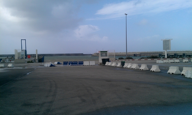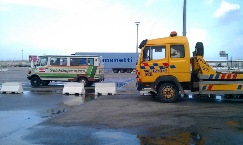 Um 5 klingelte der Wecker. Lummi kam spontan noch auf die Idee, den Spritfilter zu wechseln. Um 5.37 Uhr fuhren wir auf die Autobahn. Auf der bekannten letzten Shell-Tankstelle vor Tanger-Med füllten wir noch einmal auf. Das Terminal erreichten wir um 6.50 Uhr, die Maut vom Campingplatz zum Hafen kostete 46 MAD. Wieder einmal paßte es beinahe auf den letzten Dirham. Es wurde wieder sehr windig und regnete hier und da ein Bißchen. Wir fuhren zum Schalter unserer Fährgesellschaft FRS. „Kein Problem, einfach vorfahren!“