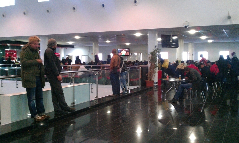 Nachdem wir eine weitere Ewigkeit gewartet hatten tranken wir noch einen Tee im Café. Nun hieß es dort: „Heute keine Fähre.“ Aber wie vertrauenswürdig waren die Leute dort? Wenn wir jetzt umkehrten, müßten wir beim zweiten Versuch die gesamte Ausreise noch einmal durchführen. Hier am Kai könnten wir direkt als erster auf eine Fähre fahren, wenn sich die See beruhigen und ein Schiff kommen würde. Wir berieten uns. Per Mehrheitsbeschluß kamen wir überein, wieder „einzureisen“, oben am Terminal zu warten und das Ticket ggf. auf die nächste hier ankommende Fähre umzutauschen. Wir standen nun bereits knapp 10 Stunden hier am Hafen.