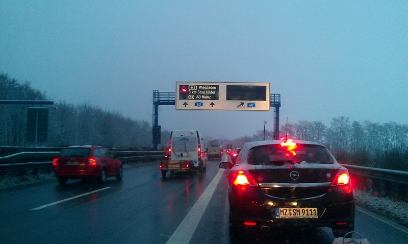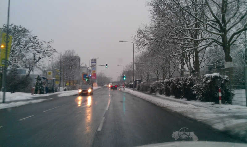 Als ich irgendwann aufwachte, waren wir bei Straßburg und Blondie saß am Steuer. Die letzte Maut war bei der Einfahrt ins Elsaß fällig, insgesamt kostete es damit in Frankreich 141,80 EUR. Während es vorm Schlafen noch angenehm mild war, waren wir nun von Schnee umgeben und bei der ersten Rast fiel ein großer Eisklotz von der vorderen Stoßstange. Widerlich. Wir riefen noch mal kurz bei Wolfi an, der schon wach war, weil er eigentlich um 6 auf die Arbeit fahren wollte. Unseretwegen meldete er sich etwas später beim Chef an und wartete auf uns. Es paßte super. Um 5.45 Uhr fuhren wir wie bei der Rückfahrt an die verwaiste Grenze bei Hagenau. Dann war es nicht mehr weit. In absoluter Dunkelheit erreichten wir Wolfis Heim in Landau um 6.20 Uhr (km 244.865).