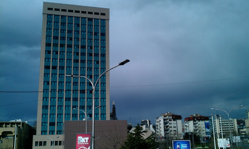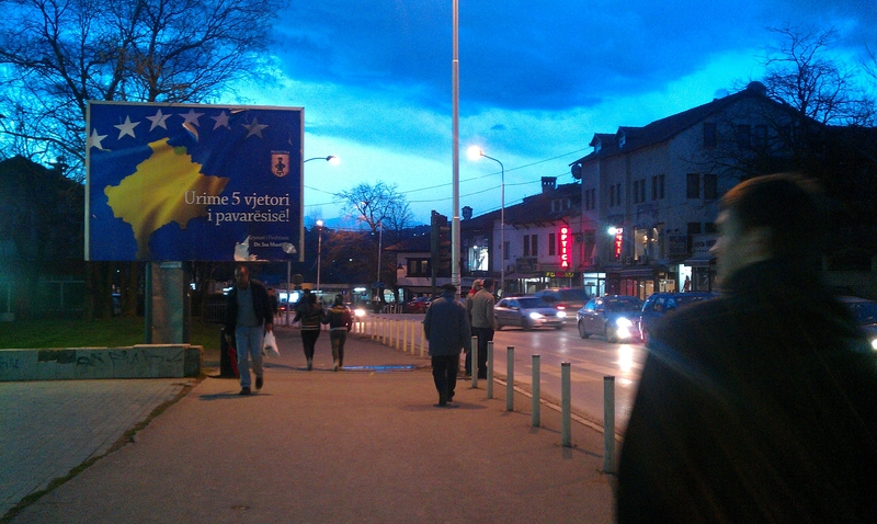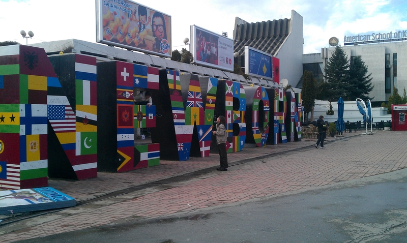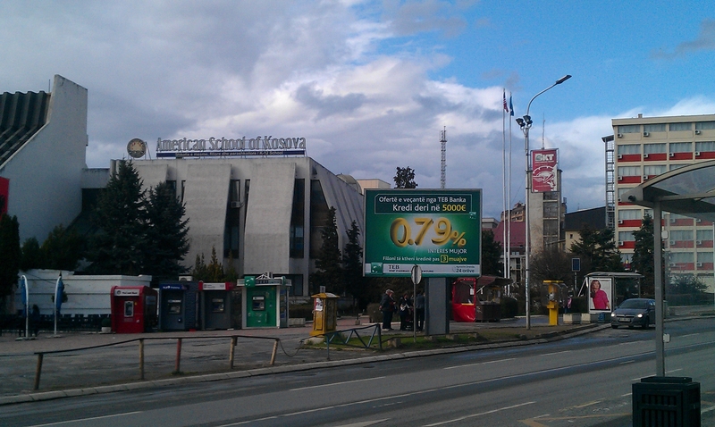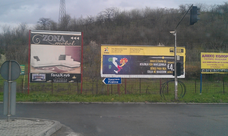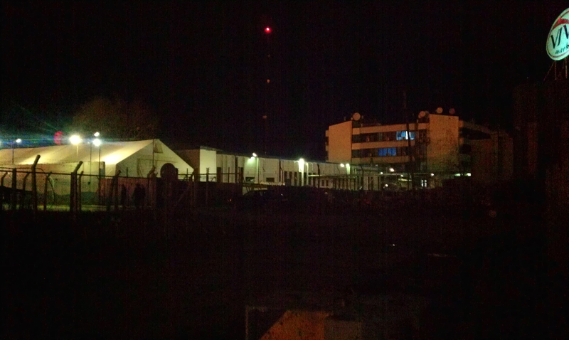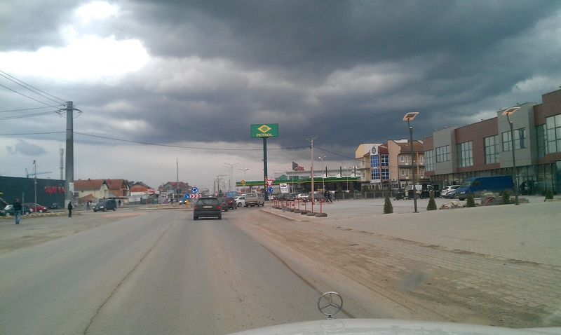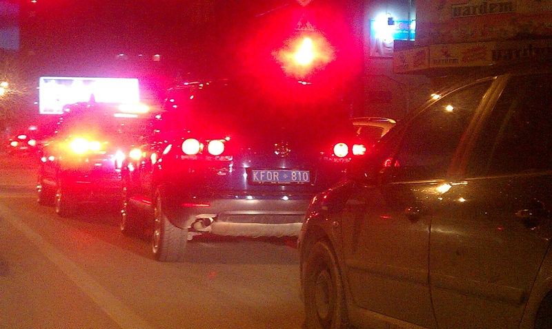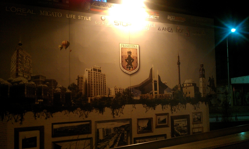 Auf Wikitravel oder einer ähnlichen Seite las ich, daß es am UNMIK-Hauptquartier einige Bars geben würde und man dort einen schönen Abend verbringen könnte. Wir nahmen ein Taxi dorthin und verabredeten uns mit dem Fahrer für später. Vor Ort war es, bis auf einen schlecht gelaunten Wachmann, ziemlich leer. Wir waren wohl falsch. Daraufhin liefen wir auf der Straße zurück, um ein Taxi zurück in die Stadt anzuhalten. Es kam keines. Chris photographierte das Schild eines „Technomarkt“, der sein Logo dreist von Media Markt geklaut hatte (Ähnlichkeiten ...), und wurde daraufhin umgehend vom Wachmann des Marktes gestellt. Der sprach kein Englisch, hatte dafür aber eine Machete als Meinungsverstärker in der Hand und war einer vernünftigen Lösung überhaupt nicht zugänglich, sondern rief die Polizei. Chris hatte ihm leider schon vorher seinen Ausweis gegeben. Wir warteten also auf die Polizei. Uns wurde mulmig. Diese kam bald und hörte sich unsere Version an (sie sprachen gutes Englisch), gab Chris seinen Ausweis sofort wieder und ließ uns unverzüglich gehen. Beim zügigen Abmarsch hörten wir, wie sie anfingen, den Wachmann zusammenzuscheißen – vermutlich weil er uns Touristen und die Polizei wegen einer solchen Nichtigkeit belästigt hatte.