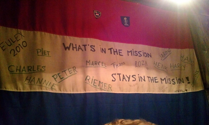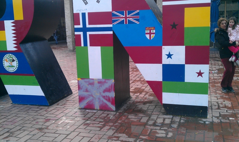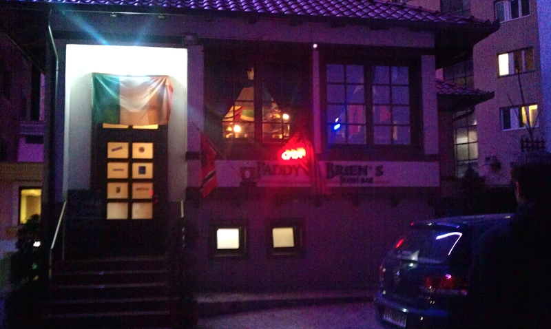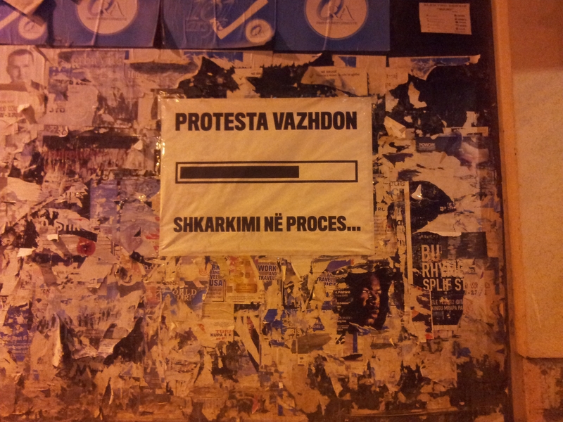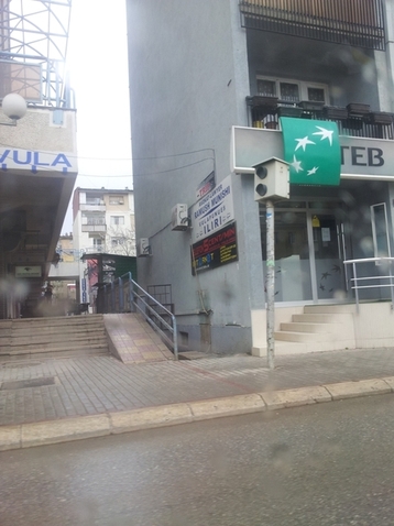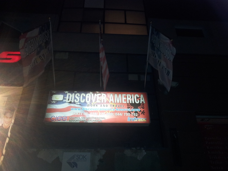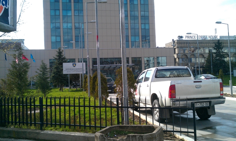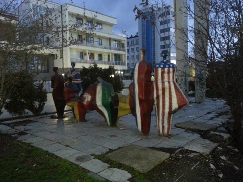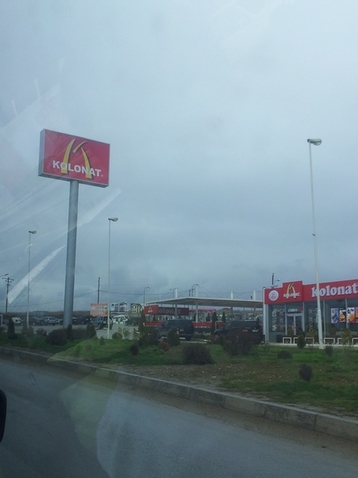Auf Wikitravel oder einer ähnlichen Seite las ich, daß es am UNMIK-Hauptquartier einige Bars geben würde und man dort einen schönen Abend verbringen könnte. Wir nahmen ein Taxi dorthin und verabredeten uns mit dem Fahrer für später. Vor Ort war es, bis auf einen schlecht gelaunten Wachmann, ziemlich leer. Wir waren wohl falsch. Daraufhin liefen wir auf der Straße zurück, um ein Taxi zurück in die Stadt anzuhalten. Es kam keines. Chris photographierte das Schild eines „Technomarkt“, der sein Logo dreist von Media Markt geklaut hatte (Ähnlichkeiten ...), und wurde daraufhin umgehend vom Wachmann des Marktes gestellt. Der sprach kein Englisch, hatte dafür aber eine Machete als Meinungsverstärker in der Hand und war einer vernünftigen Lösung überhaupt nicht zugänglich, sondern rief die Polizei. Chris hatte ihm leider schon vorher seinen Ausweis gegeben. Wir warteten also auf die Polizei. Uns wurde mulmig. Diese kam bald und hörte sich unsere Version an (sie sprachen gutes Englisch), gab Chris seinen Ausweis sofort wieder und ließ uns unverzüglich gehen. Beim zügigen Abmarsch hörten wir, wie sie anfingen, den Wachmann zusammenzuscheißen – vermutlich weil er uns Touristen und die Polizei wegen einer solchen Nichtigkeit belästigt hatte.