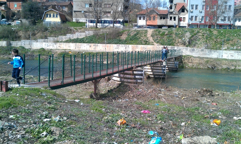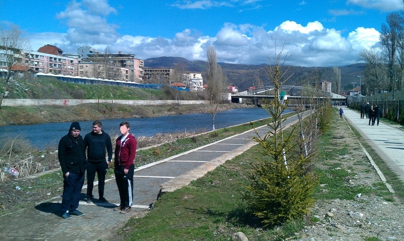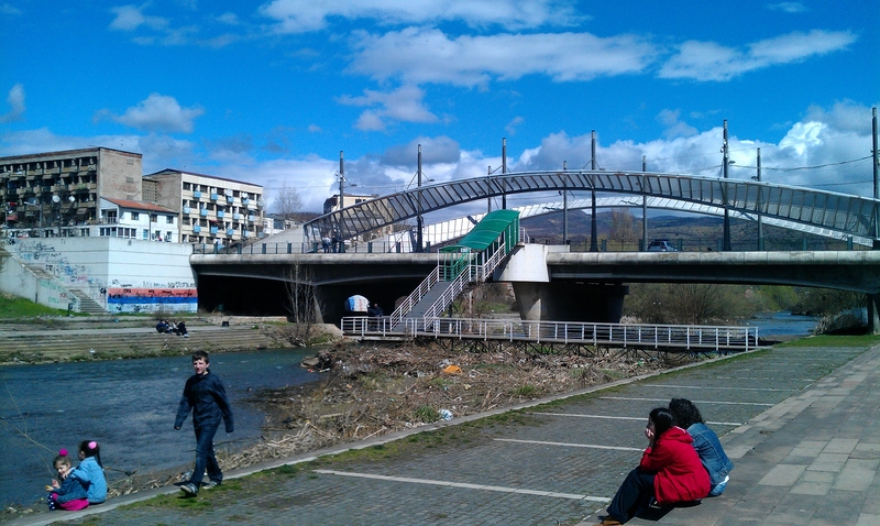 Hier drehten wir sicherheitshalber um. Es handelte sich um den NATO-Checkpoint zum serbischen Nordkosovo, der nicht unter dem Einflußbereich der kosovarischen Regierung steht. In der Stadt selbst, auf albanischer Seite, fuhren wir bis zur Brücke von Mitrovica vor und fanden auch direkt einen Parkplatz. Wir gingen bis zur Höhe der die Brücke beschützenden NATO-Soldaten, aber trauten uns nicht rüber. Die Einheimischen gingen zwischen den beiden Stadtteilen hin und her, als sei hier nie etwas gewesen. Auch etwas weiter links gab es einen kleinen Steg über den Fluß, auf dem Kinder herumtollten.