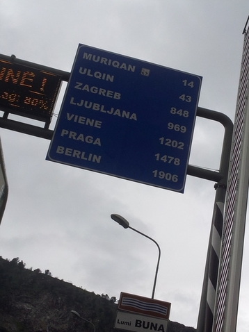 Bei Shkoder fuhren wir über die bekannte Brücke mit den witzigen Entfernungsangaben und am Ufer des Shkodersees in eine Sackgasse in Richtung der montenegrinischen Grenze.