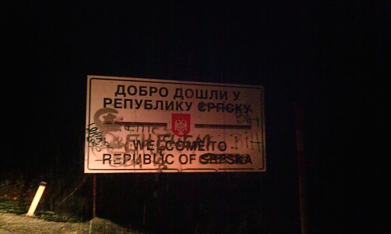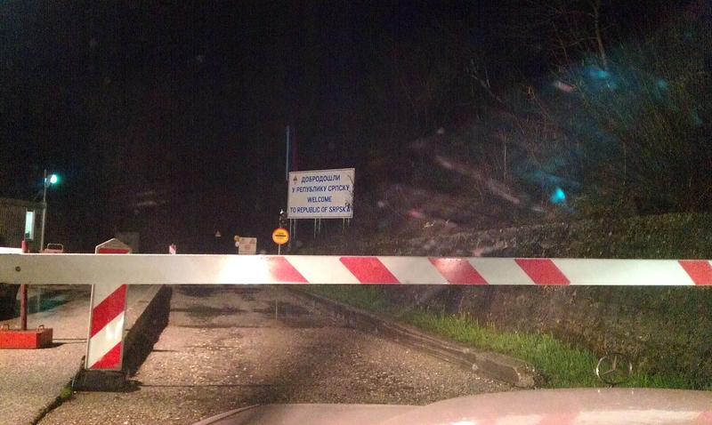 Die Grenze nach Montenegro war gewohnt lässig. Wir rasten durch, am trostlosen Podgorica vorbei und bei Nikšić in die Nacht hinein. War die Grenze nach Bosnien namens „Hum“ überhaupt offen? Auf der Karte sah die Straße so extrem klein aus. Einzig das dort vermerkte Zeichen für „Grenzübergang“ stimmte uns hoffnungsfroh. Nun war es stockduster. Steine fielen zahlreich von den Wänden herab und lagen auf der Straße herum. Wir hofften, daß uns keiner treffen würde. Den Abzweig zum Durmitor-Park liegen wir rechts liegen, genauso den Pivsko-See links. Die Straße wurde eng und wir standen am Grenzposten. Bei der Ausreise wurde kurz der Kofferraum durchwühlt und der Montenegriner machte einige Scherze. Aber sonst alles lässig. Wir betraten Bosnien. Nein, eigentlich nicht Bosnien, sondern die Republika Srpska, die serbische Republik in Bosnien, deren Bewohner überhaupt gar nichts mit den Bosniaken und diesem Staat zu tun haben wollen und sich am liebsten ohne Umwege wieder ins große serbische Mutterland integrieren lassen würden.
